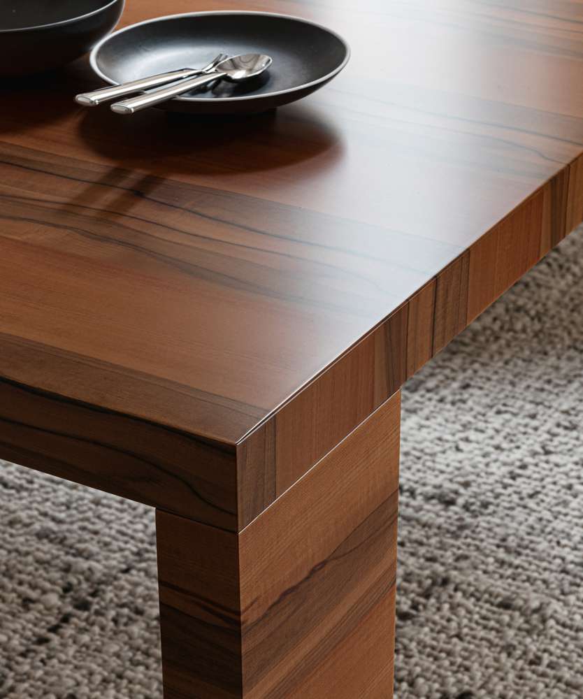 A striking table, with an essential design underscored by thick profiles and asymmetrical legs, making it a piece of furniture that dominates any room. Available in one square and two rectangular sizes (cm.160x160, cm.110 x 240, cm.110x300), the table now comes in a new version in semigloss Chilean tineo wood, a precise stylistic feature also found in other pieces in the collection, as well as in more classical natural wenge or brushed light, brushed black and grey oak. The special folding technique used to create it highlights the table’s refined workmanship, creating perfect continuity between the surface and the edges of the top.
