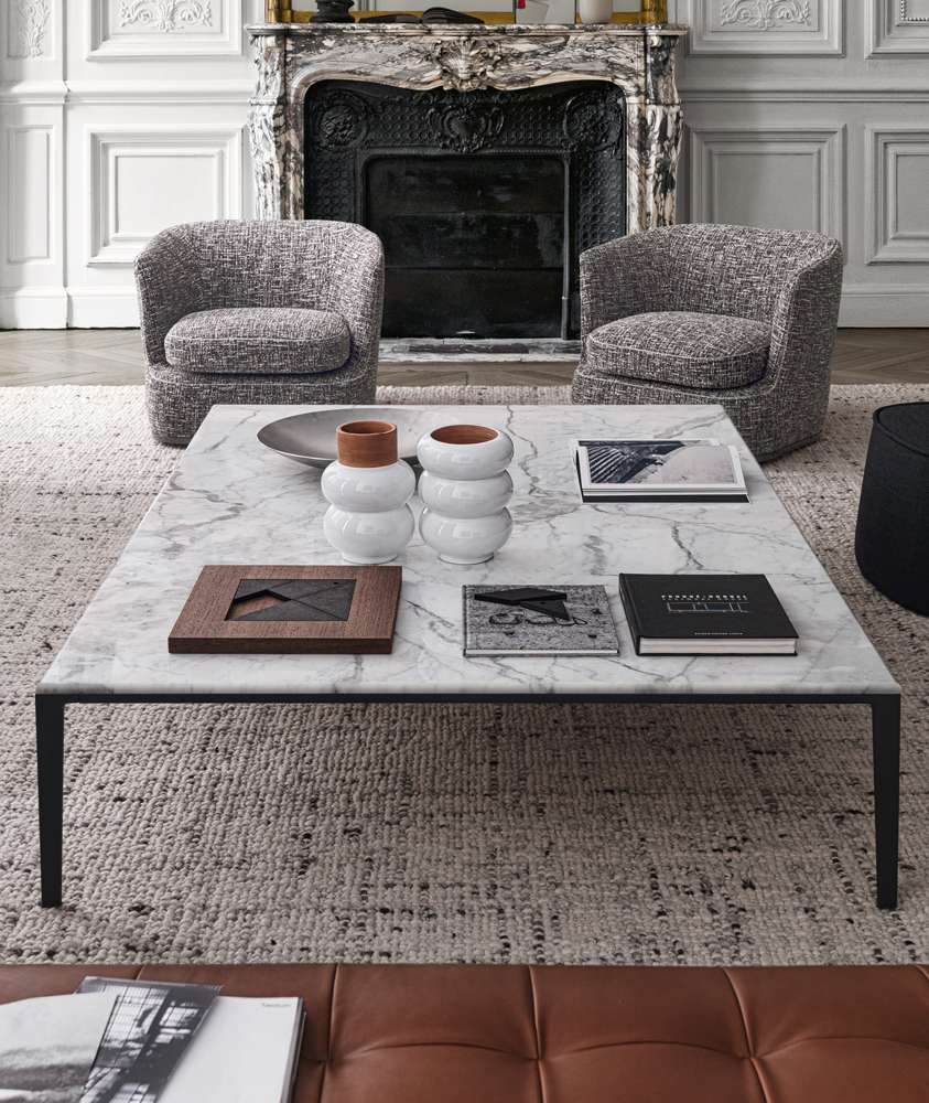 細いアルミダイキャスト製の構造体と美しい大理石の天板を組み合わせたローテーブルのシリーズ。サイズは正方形1種類と長方形2種類(90x90cm、90x130cm、130x180cm)があり、様々な仕上げでカスタマイズが可能です。天板は大理石(カラカッタ・ホワイト、マルキニア・ブラック、グアテマラ・グリーン、サハラ・ノワール)からお選びいただけます。