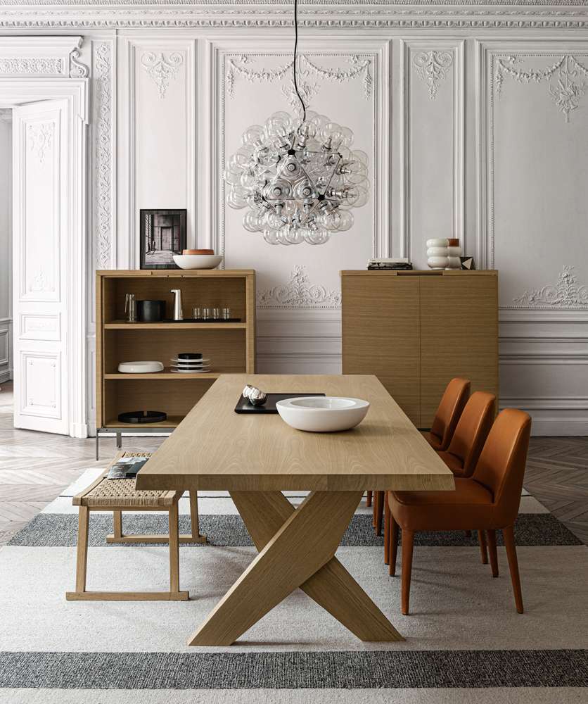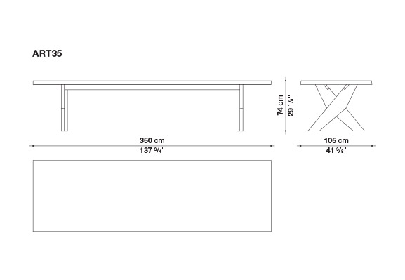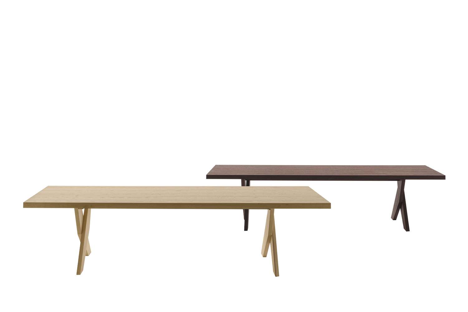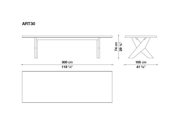 Ares<アレス>の無垢材を使用したX字型の脚部は、2つの形状が重なり合って形成されており、その力強い美しさが特徴です。厚みのある長方形の天板は、2つのサイズ(300x105cmと350x105cm)があり、数種類の木材が用意されています。