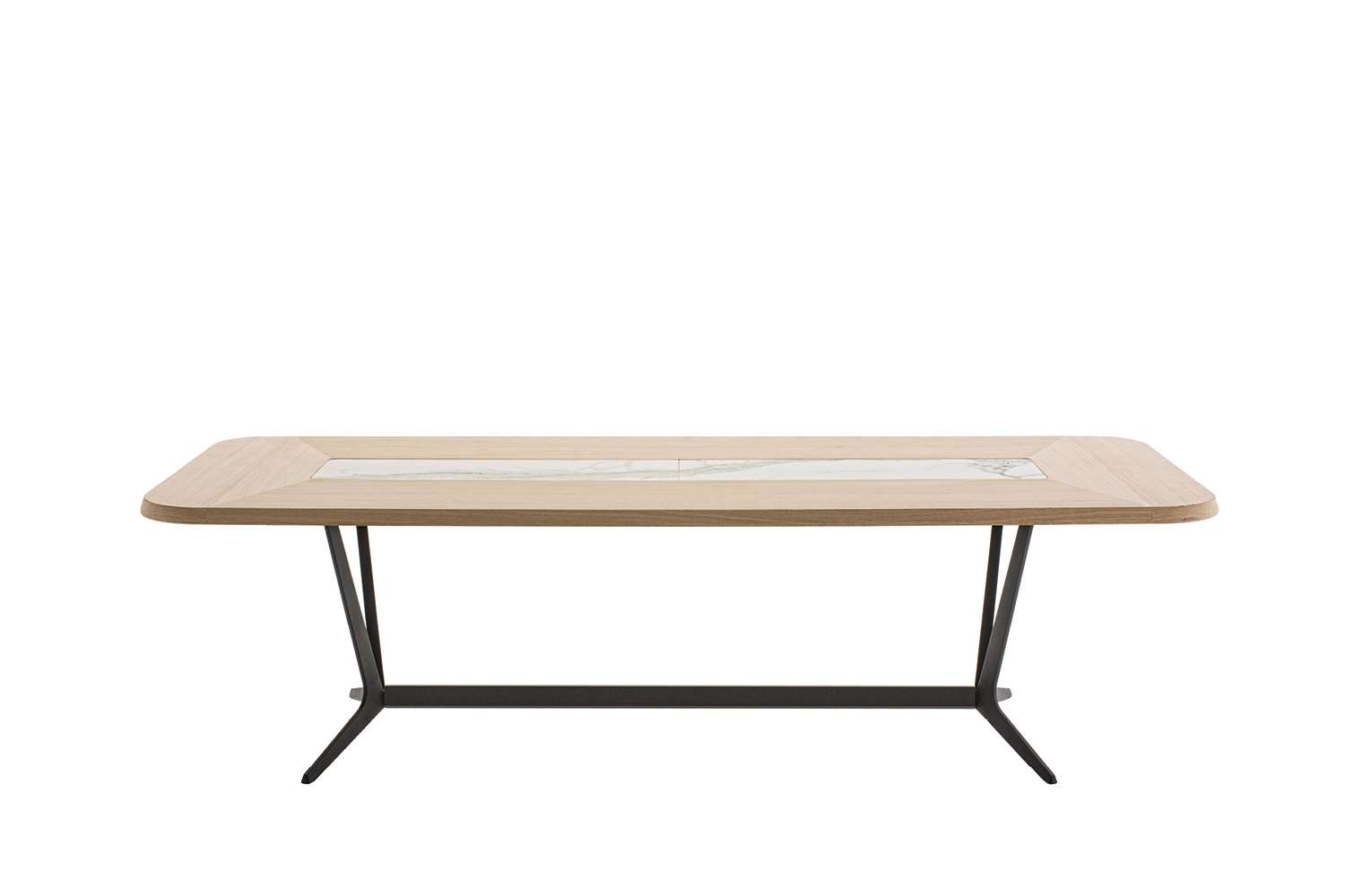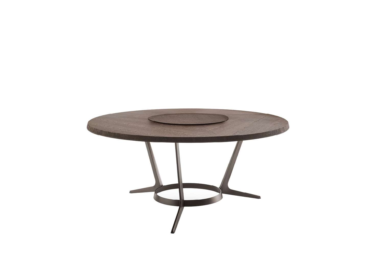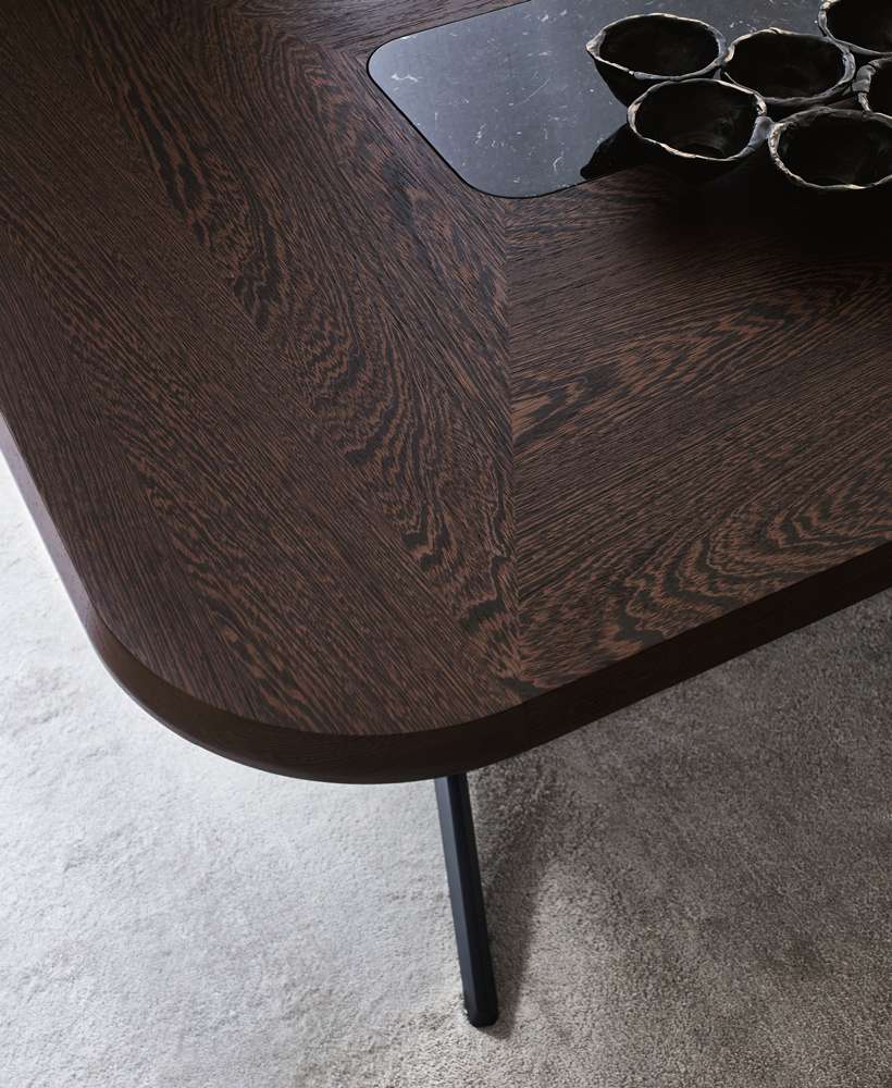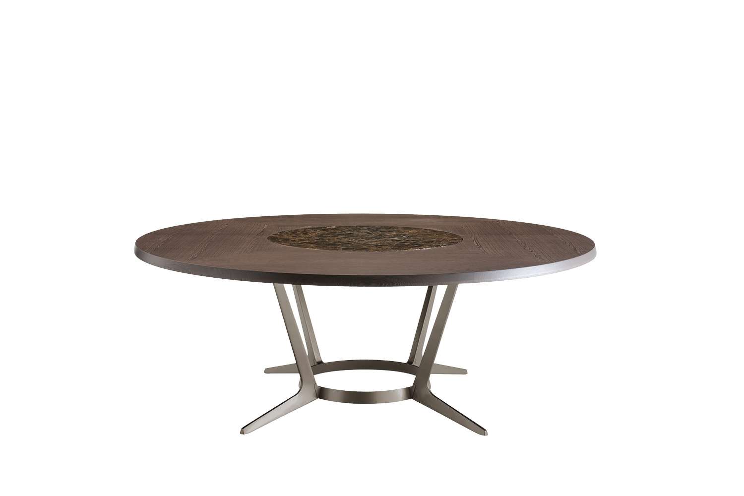天板は長方形と円形があり、サポート脚は一体成型のダイキャストアルミニウム製で、2つもしくは3つの脚がクロスバーで連結されています。円形テーブルは木質5種、大理石4種から選ぶことができ、よりエレガントな仕様として木質天板の中央部に光沢のある大理石を嵌め込んだタイプもあります。円形テーブルのみ、センターに木質もしくは大理石の回転トレーを載せることもできます。