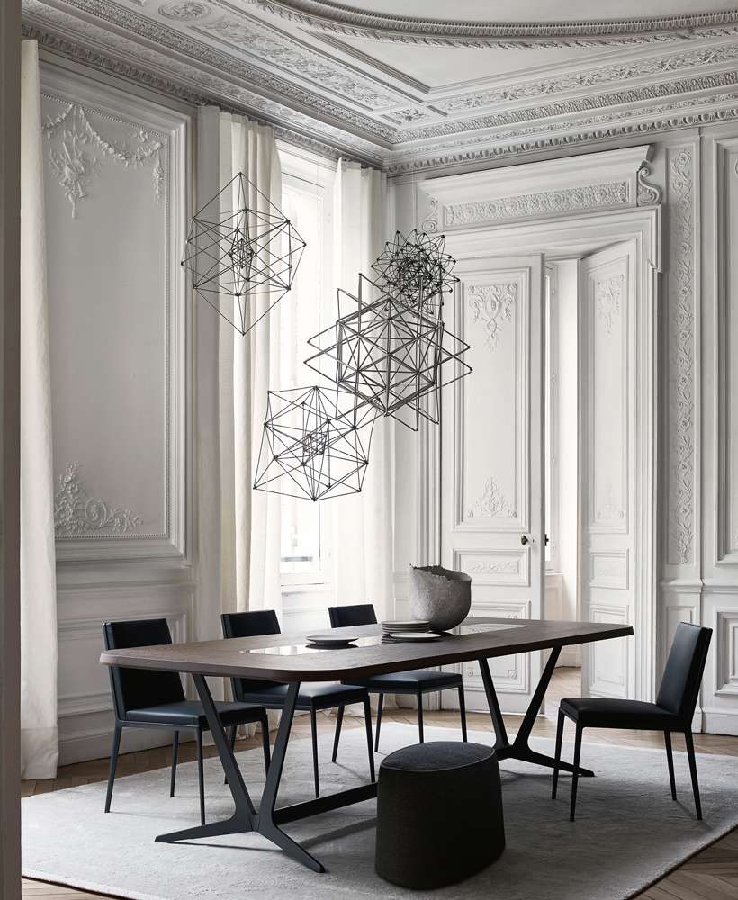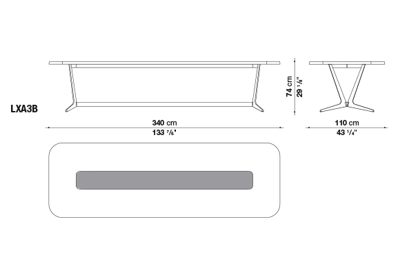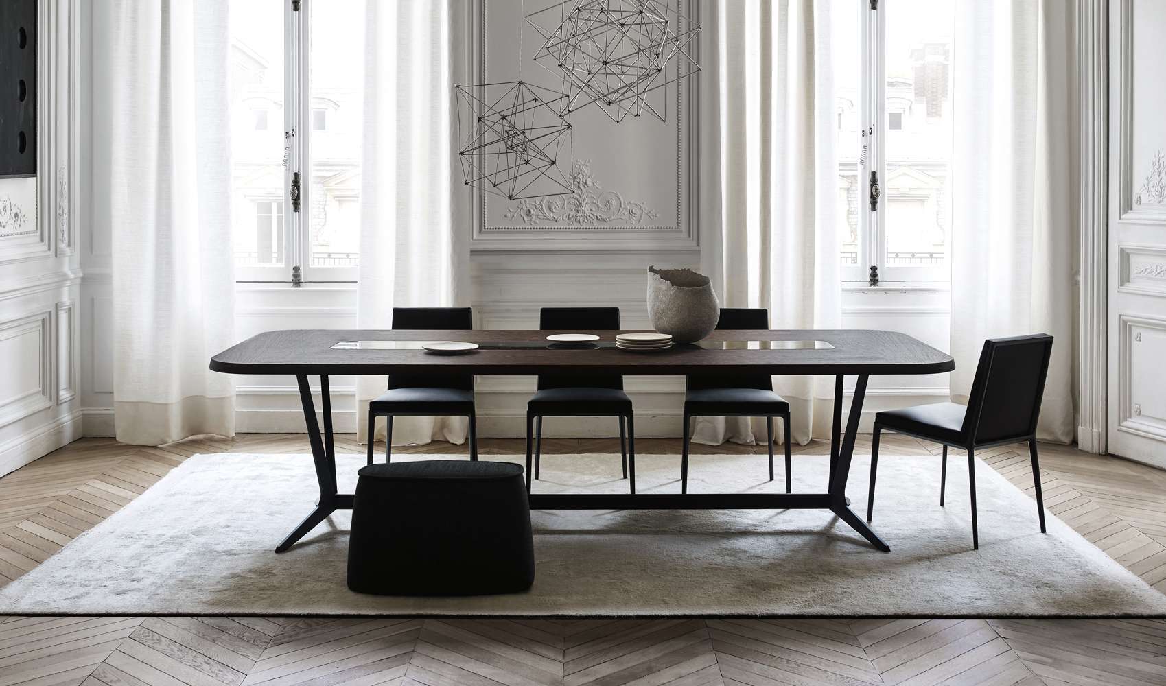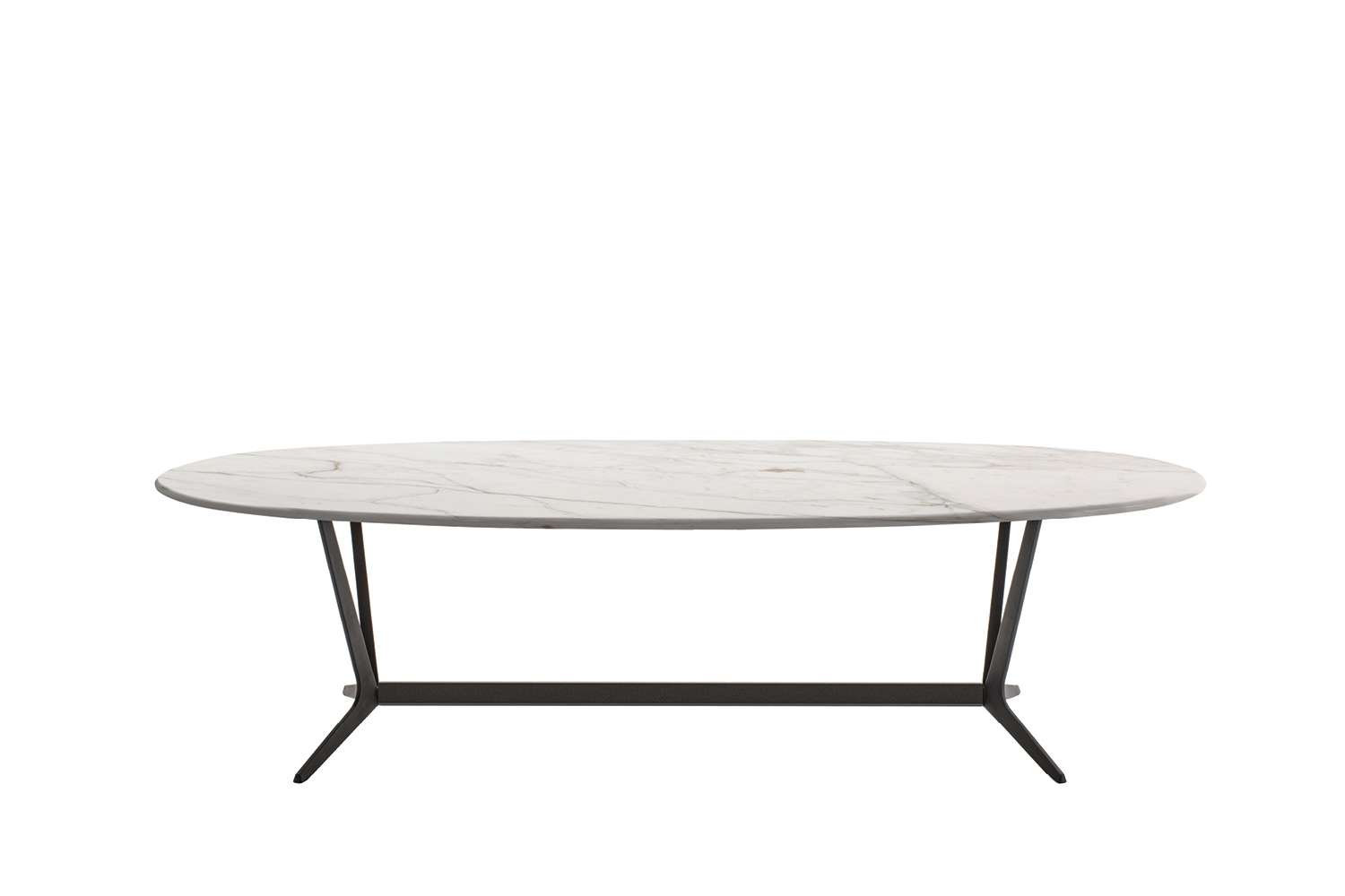 Astrum<アストラム>は、長方形、円形、楕円形のテーブルコレクションで、特別な"ソウホース"と呼ばれる作業台をモチーフにしたベースフレームが特徴です。グラファイトまたはアンバーの塗装が施されたダイキャストアルミニウム製の脚部で、2つまたは3つの脚がクロスバーで連結されています。