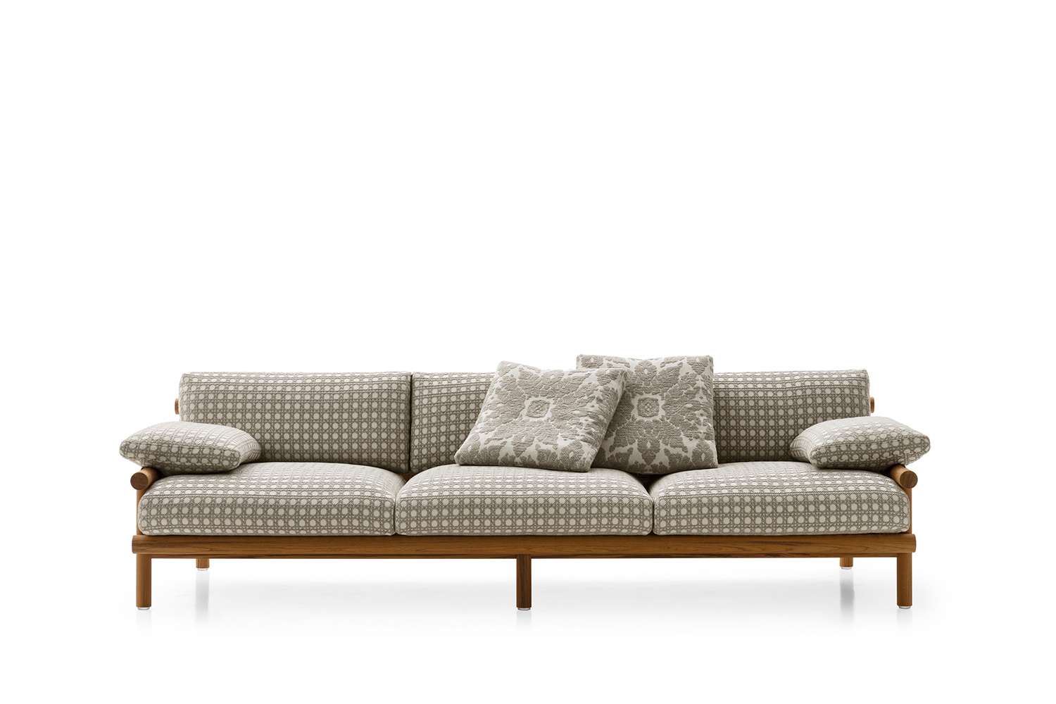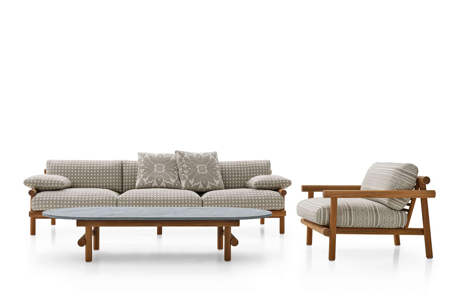 座面が2個または3個からなるソファとアームチェアには異なる高さのアームレストがあります。アームチェアのアームレストがより高くなっているのは、人間工学に基づいた寸法を確保するためです。低い方のソファのアームレストには取り外しが容易なクッションがあり、必要に合わせて快適に寝そべることもできます。このコレクションの際立った装飾はひとつひとつのクッションであり、全て防水性ファブリックでカバーリングされています。