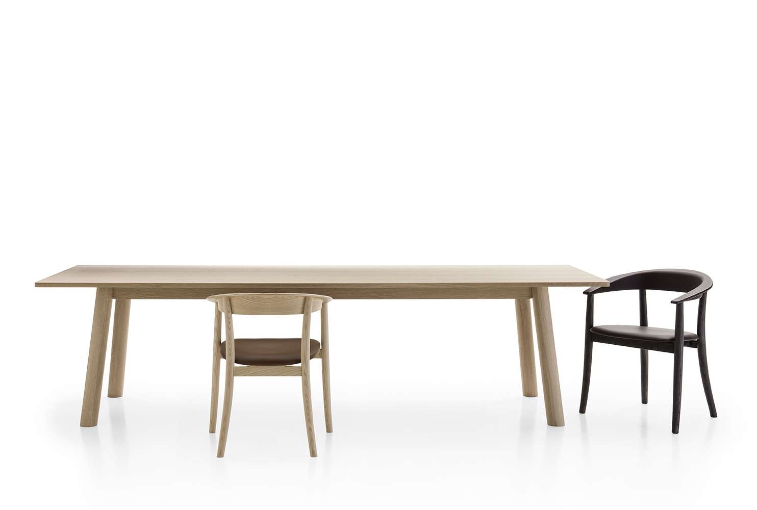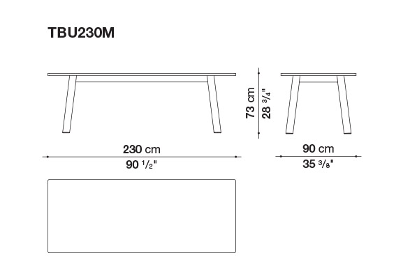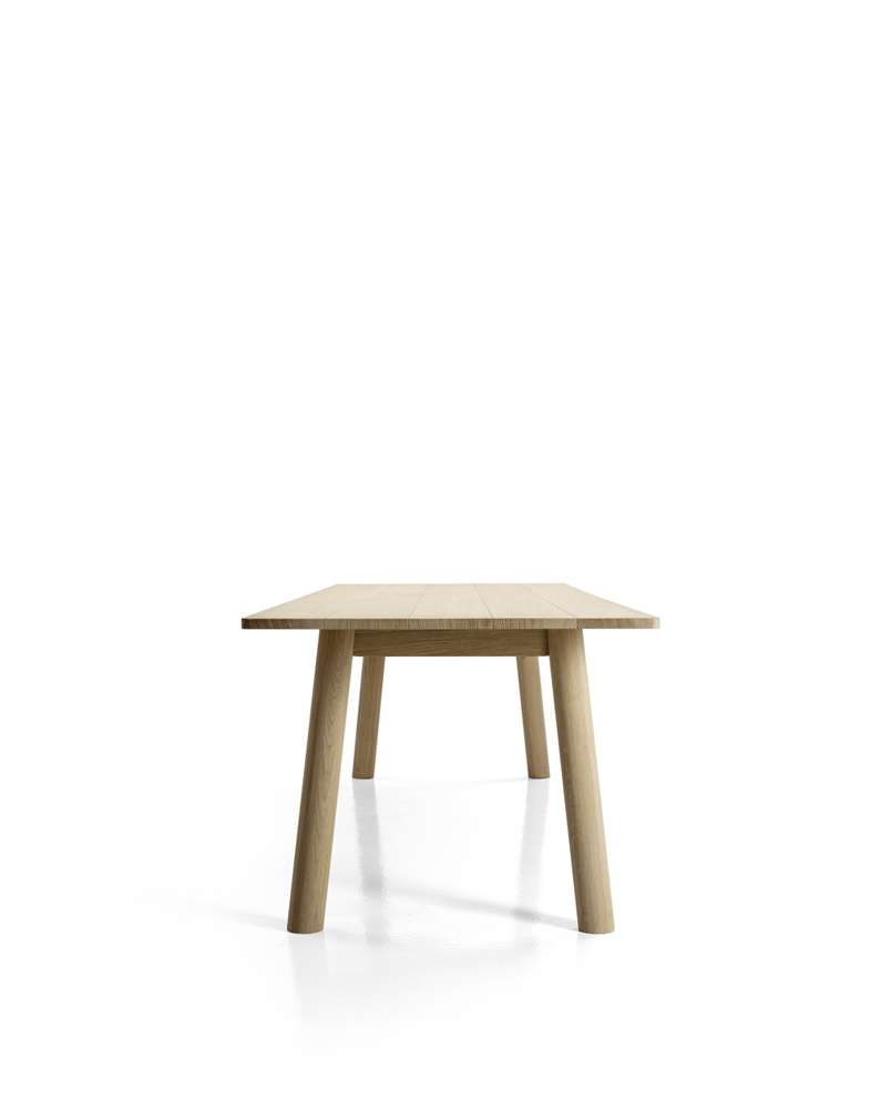 深澤直人のBull<ブル>テーブルは、とてもソリッドな、けれども極めて洗練された存在を表現しています。様式的な構成は、デザイナーのはっきりした言語から成り立っていて、このブル テーブルの場合は、構成するエレメント同士の控えめで構造的な緊張感が、太くて丸いソリッドな断面が地面から斜めに生えているように感じられ、薄い天板の軽やかさとのコントラストが際立っています。天板は230cmと280cmの2種類のサイズがあり、それぞれ全体が全て同じ仕上の場合、ライトオーク、グレイオーク、ブラックオーク、スモークオークから選べます。あるいは、脚部構造がこれらの色合いのオークに対して、天板が大理石の組み合わせとして、いずれもマット仕上のブラック・マルキニアとホワイト、カラーラ・スタチュアリットが選べます。