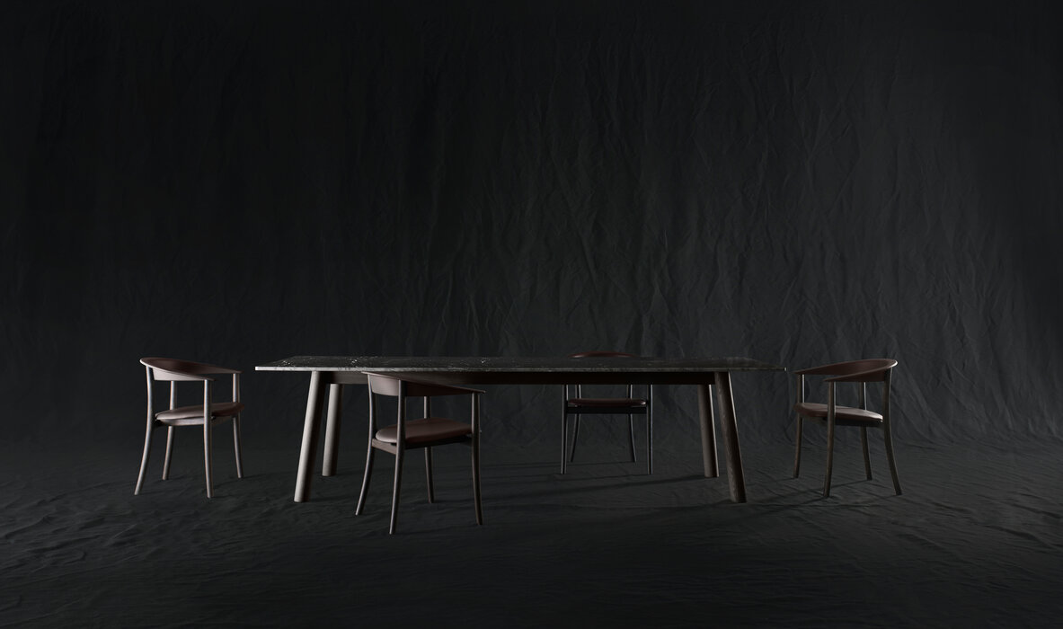 "その名前から感じ取れるように、ブルは4本の脚がまるで大地から突き出たかのようにみえるテーブルです。私は、このしっかりとしたテーブルをデザインするにあたり、エレガントなチェアとの組み合わせを考えてみました。そして両方が合わさるとまるで、美女と野獣のように見えるということです。どちらにしても素晴らしい見栄えのテーブルができたと考えています。" ー 深澤直人