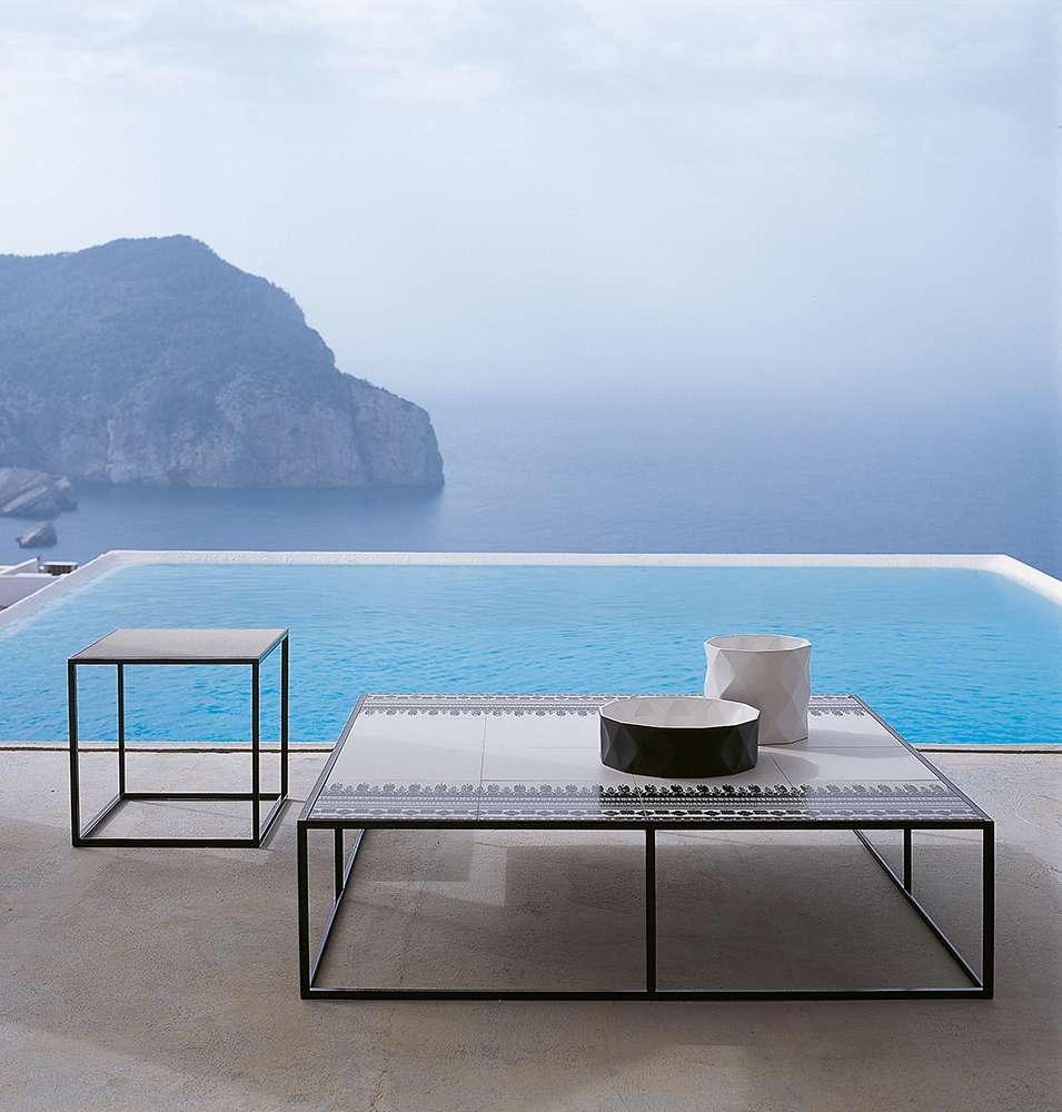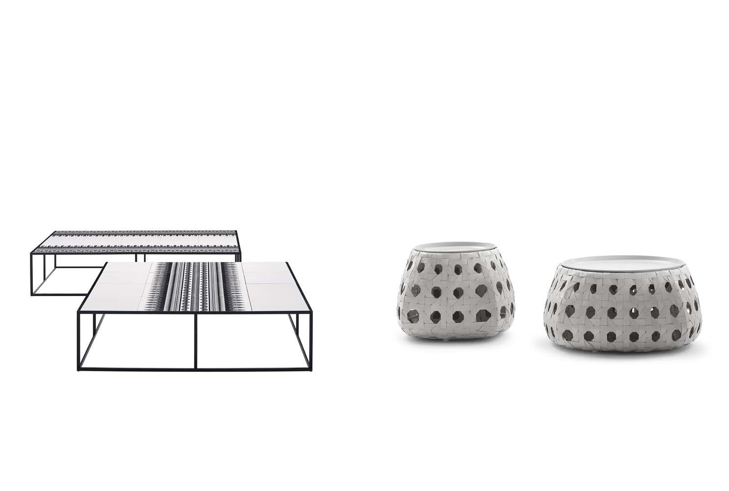 カナスタシリーズはポリエステル素材を折り合わせた仕上げが特徴で、色は白かブロンズからお選び頂けます。形は円形、リニアソファ、アームチェア、チェア、シェーズロング、サービスエレメントと様々です。すべてのフレームはアウトドアに適したアルミニウム素材にポリエステルパウダーペイントが施されています。円形のカナスタは蓋をつけることも可能で、蓋により92%の日差しを防ぐことができます。こちらは回転仕様も選択できます。カナスタコレクションには大きさ、仕上げの異なったテーブルもあります。テーブルはポリエステルを折り合わせた素材かスチールから選択可能です。テーブルトップは模様の入った仕上げもご用意しています。