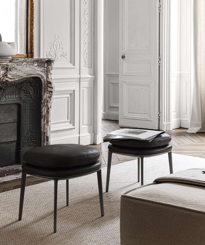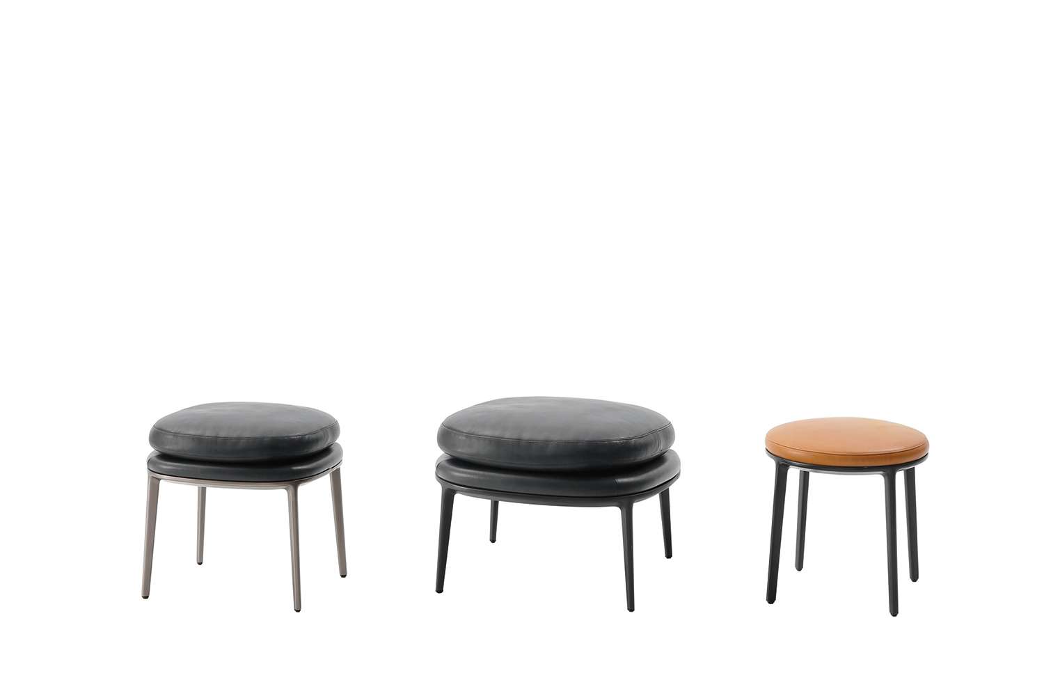 Caratos<カラトス>シリーズに、2種類のバージョンのチェア、アームチェア、オットマン、コーヒーテーブルが新たに提案されました。これらの新しいアイテムは、オリジナルのデザインの本質的な特徴を反映し、強化すると同時に、包み込むような形状を取り入れることで、デザインを柔らかくしています。グラファイトまたはアンバーに塗装された軽量のアルミダイキャスト構造はそのままに、パッド入りの背もたれがアームレストの形成に寄与し、姿勢を全く制限しないシーティングを実現し、隣人との会話や関係を促進します。オットマンとコーヒーテーブルはフレームのデザインを反映しており、シートを補完する理想的なアイテムとして、会話の場や社交の場を演出します。