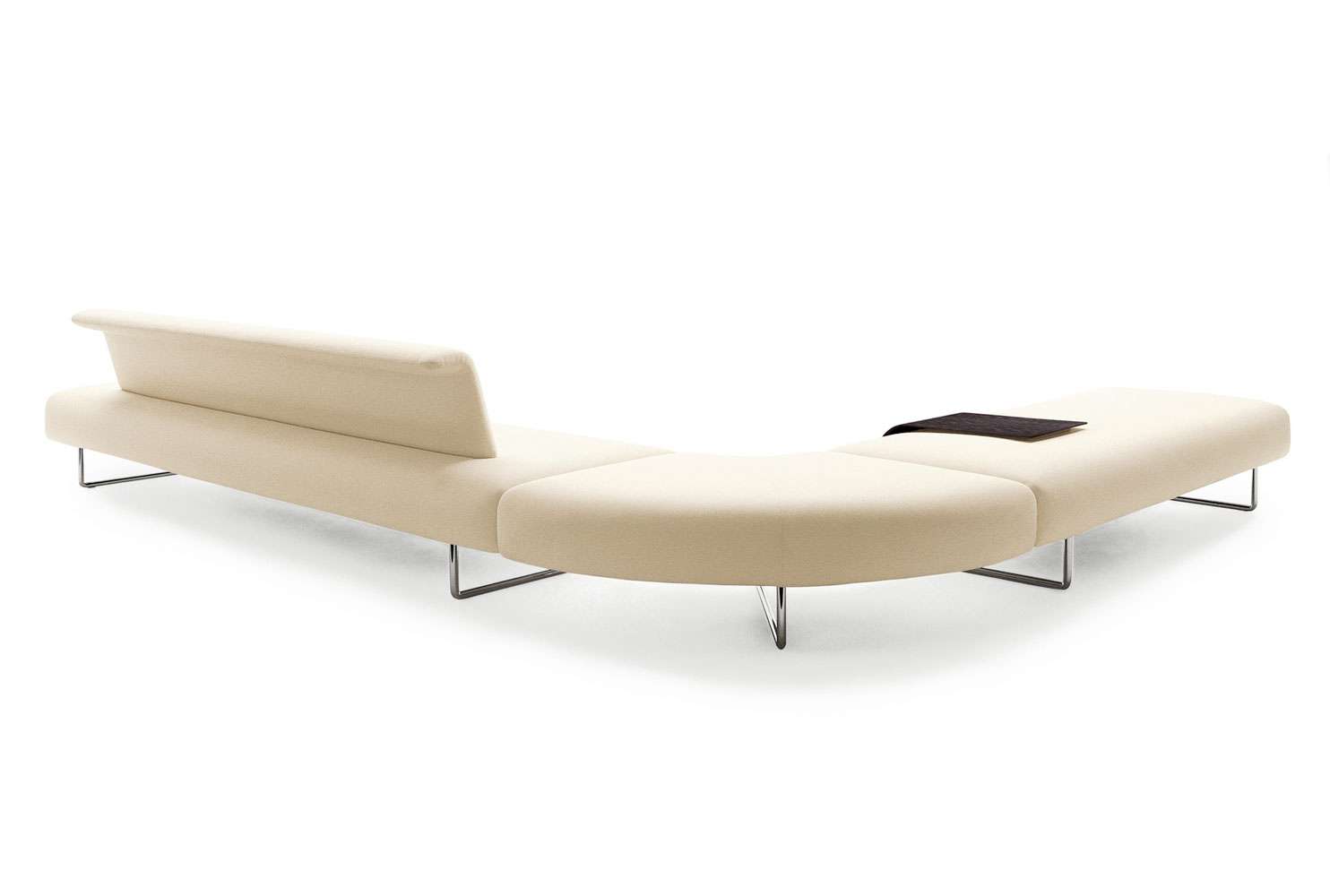 ミニマリズムとベーシックなラインで構成された長い布張りのベンチは、背もたれの有無にかかわらず、心地よさと無重力を感じさせます。正面から見ると重厚感があり、側面から見ると彫刻されたブロックのようにスリムになっています。また、明るい金属製のチューブ状のサポートによって空中に浮いているような効果を高めるゆったりとしたサイズは、デザイナーがこのプロジェクトに与えた「Cloud」という名前によって完璧に象徴されています。座面に比べて小さく見える背もたれは、上部に短い折り返し部分があり、座ったまま腕を休めることができます。4分の1円のようなカーブを描くジョイントは、背もたれのあるなしにかかわらず、異なるサイズのベンチを組み合わせて、さまざまな長さと形のシートを作ることができ、公共の場にオリジナルな風景を生み出します。最後に、エレガントな木製のボードをシートの上に置き、天板やサービスの要素として使用することもできます。