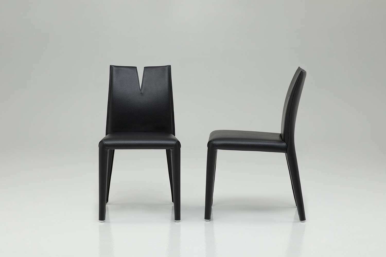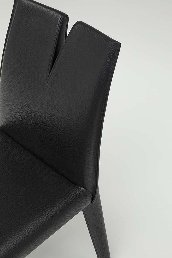 椅子の背もたれは、偉大な芸術家ルチオ・フォンタナへのオマージュであるカットで切り取られています。しかし、カッターの本質は美的な選択だけではなく、これまでにないタイプのシーティングを生み出すことにあります。双子の背もたれの端は、正面からの姿勢では機能的で快適であるが、独立して動き、横向きの姿勢も可能である。この体勢は、近くに座っている人との会話に適しています。また、背もたれに腕を回して片側に寄りかかることができるなど、高い座り心地とカジュアルな動きを実現しています。座面のフレームは金属とウェビングでできており、クラシックなポリウレタンの張り地で柔らかく仕上げられています。B&B Italiaの研究開発センターでは、ダブルバックレストの弾力性と強度を確保するために、洗練されたハーモニック・スチール・コアを採用しました。張り地とカバーは、エンボス加工された厚手のレザーでチェアをすっぽりと包み込み、柔らかさと硬さの理想的な融合を実現し、サドルステッチで強調されています。 中央のカットからは、洗練されたブラックサフィアーノの厚手のレザーで作られたインナーパーツが現れ、まるでカッターの魂がこの劇的な開口部から覗いているかのようです。