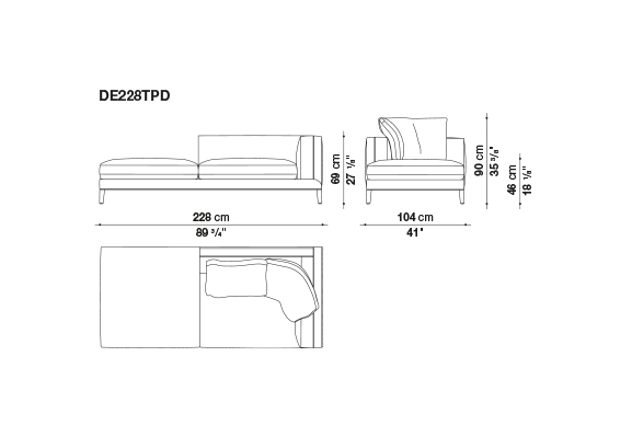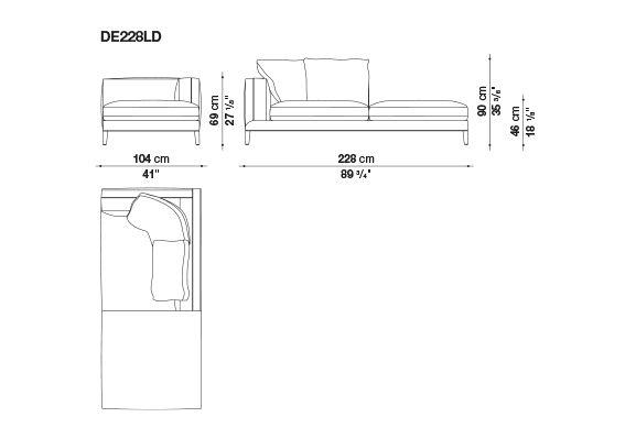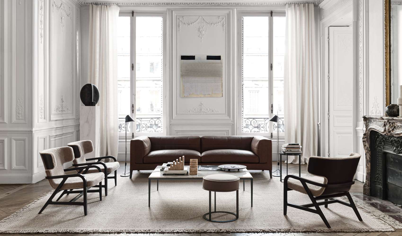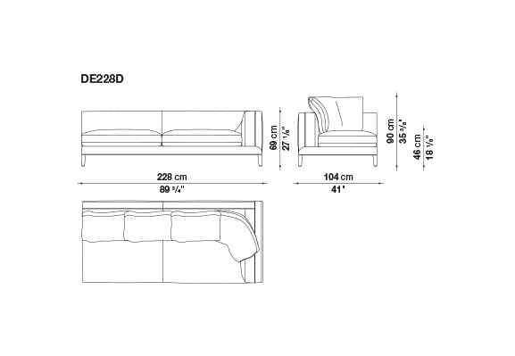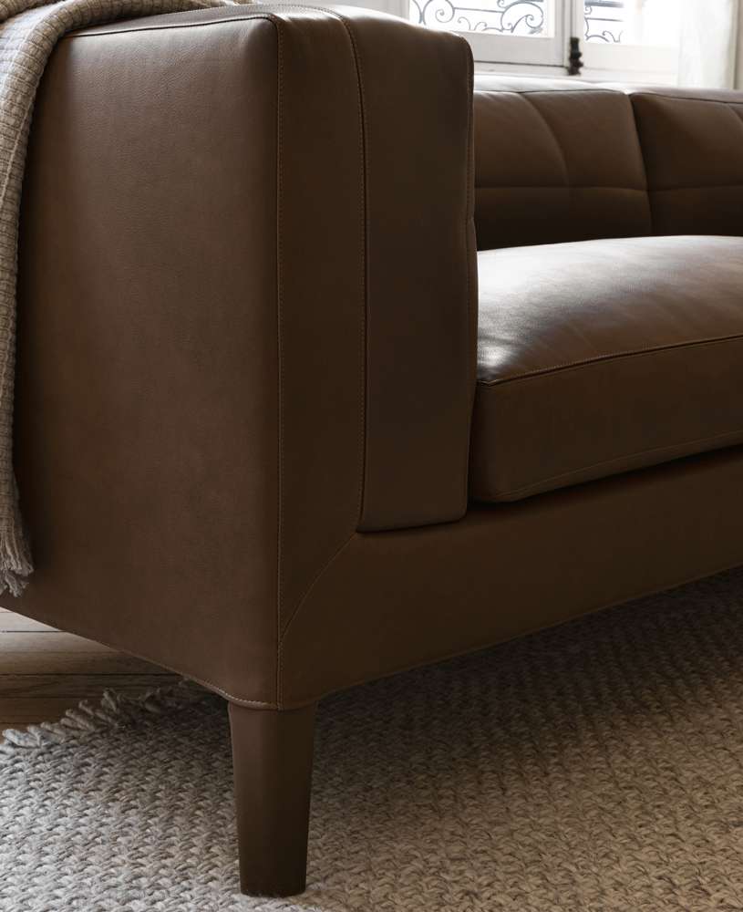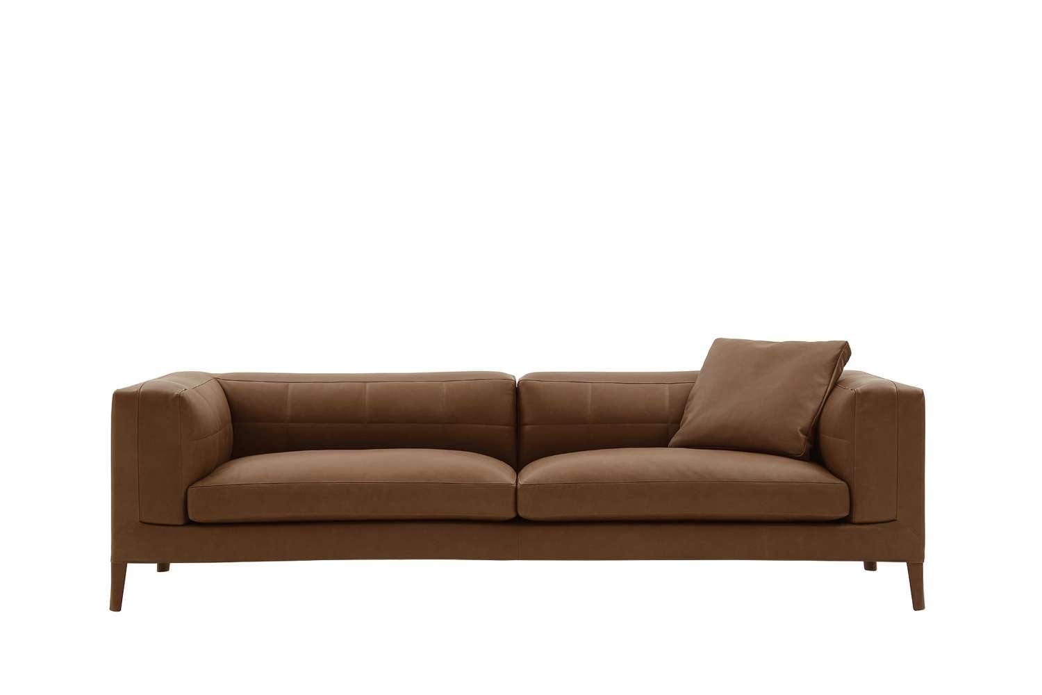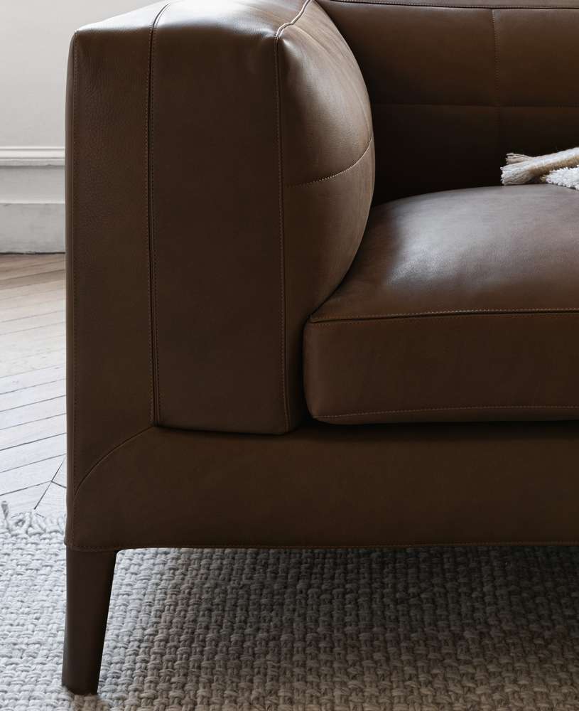 Dives Softは、様々なサイズと2種類の座面奥行きを持つ直線的なモジュール式のソファです。座面の奥行きが狭いバージョン(89cm)は、アームレストと背もたれが、外側はスムース、内側はクラシックなチェスターフィールドスタイルのキルティングという、2種類の異なる張り方をしているのが特徴です。洗練されたディテールを楽しむことができます。座面の幅が広いバージョン(104cm)では、張地は全体的にスムースで、柔らかいダウンフェザーのクッションが付いており、よりくつろげるソファになっています。どちらのバージョンにも共通して、ソフトでたっぷりとしたパッドが入っており、最高の座り心地を実現しています。張り地には幅広い種類のファブリックとレザーが用意されており、ファブリックバージョンでは装飾的な同色または対照的なブランケットステッチ、レザーバージョンではエレガントな「エンベロープステッチ」など、特別なクチュールディテールが施されています。脚部は、ファブリックまたはレザーで覆われているか、ブラックシェラック仕上げが用意されています。