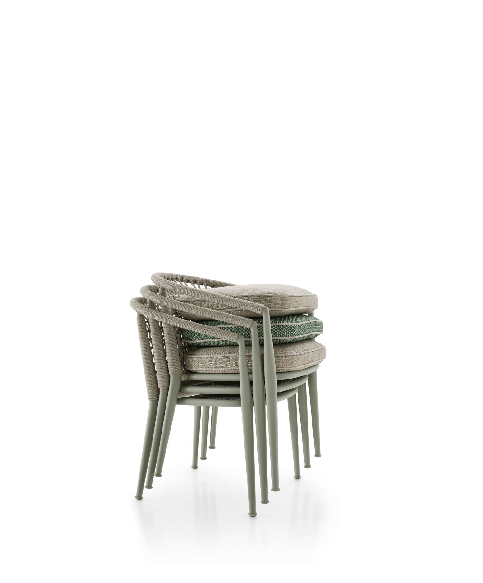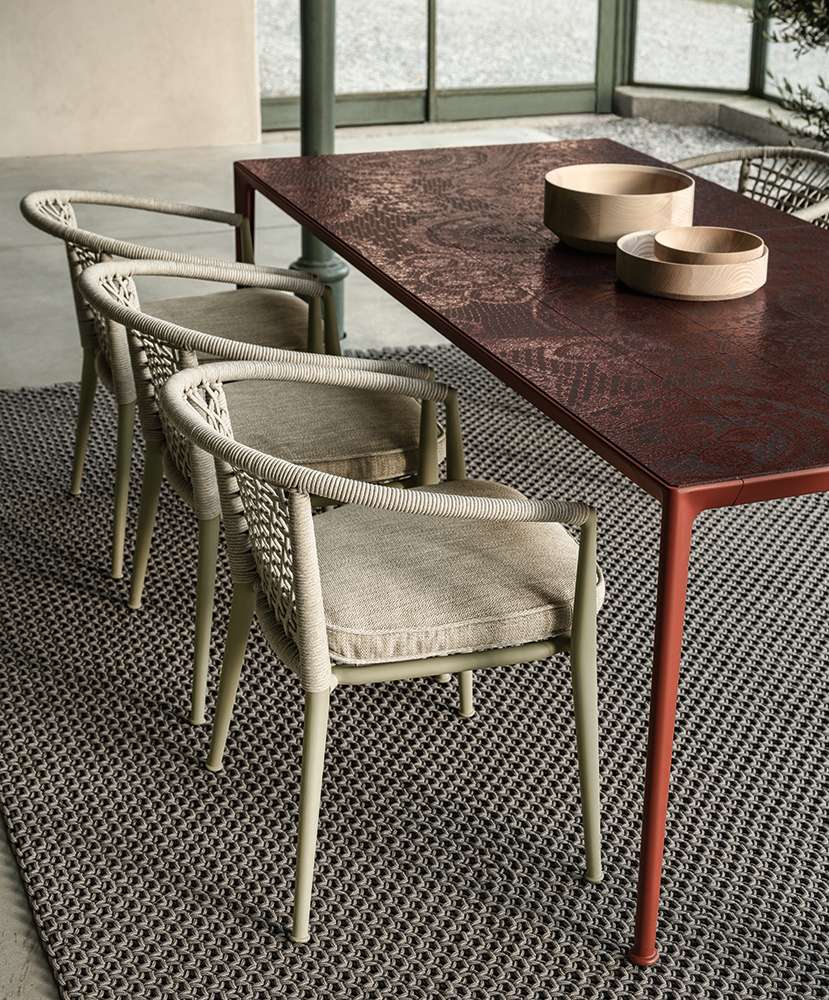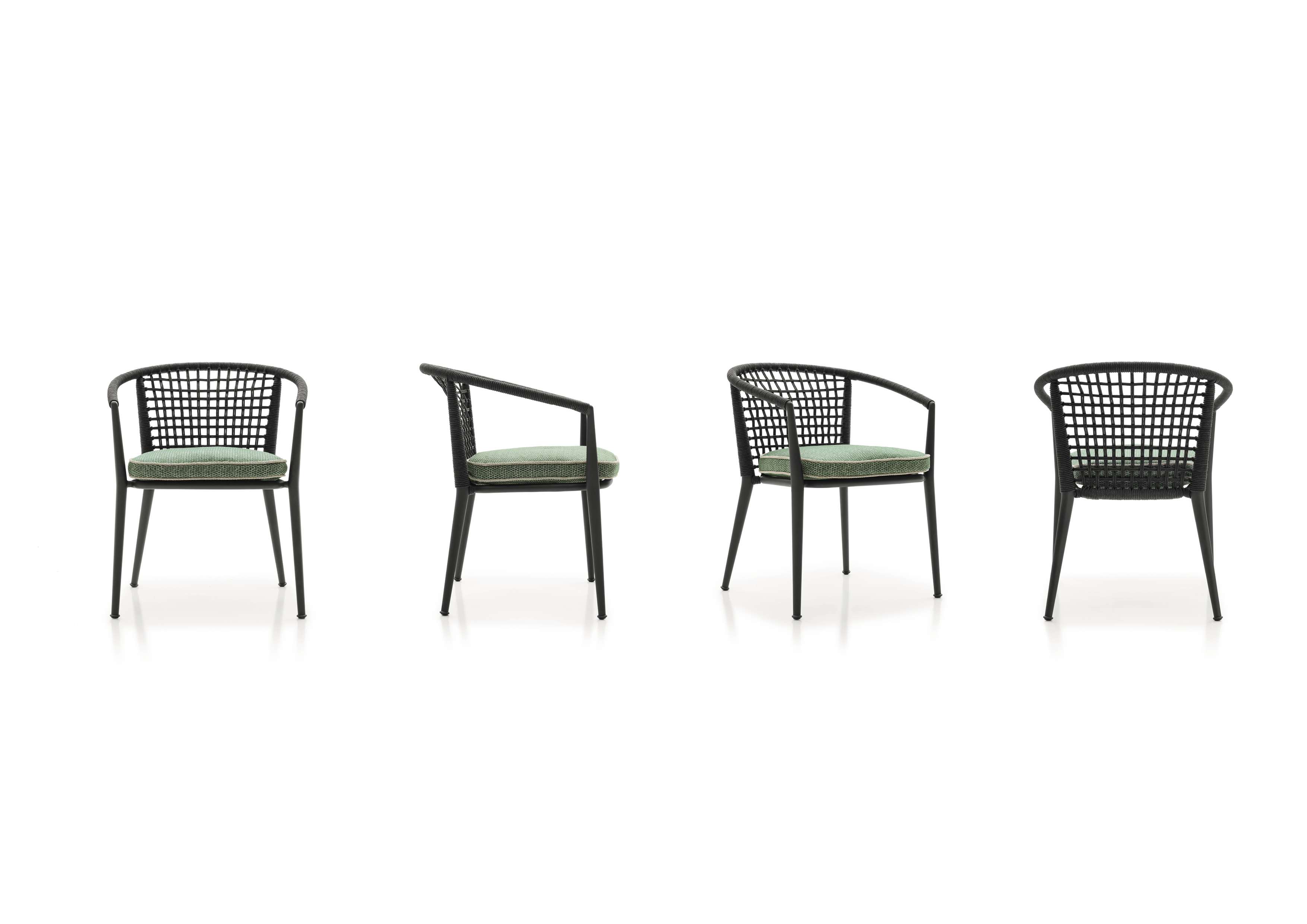 塗装されたアルミニウム製のフレームと、独自のインターレースが特徴的な背もたれを備えた、曲線的で包み込むようなデザインの屋外用チェアErica '19<エリカ'19>。洗練されたカラーコンビネーションは、フレームとインターレースの単色または2色で構成されています。また、シートクッションには幅広い種類のファブリックカバーが用意されています。Erica'19コレクションには、チェアのほかにソファやアームチェアもあります。