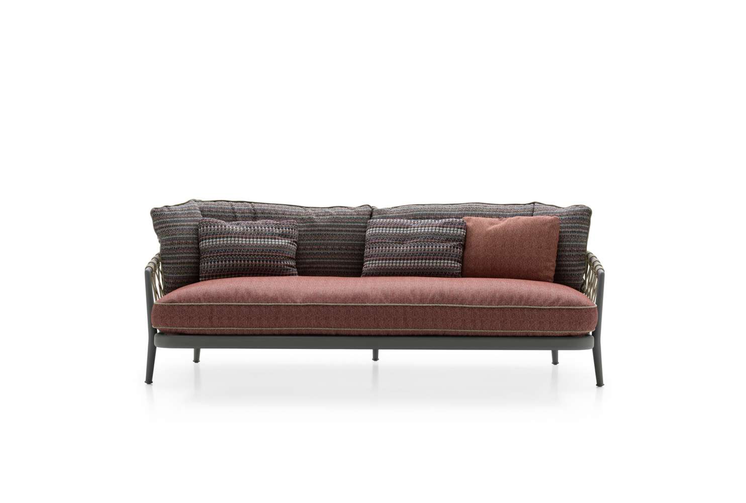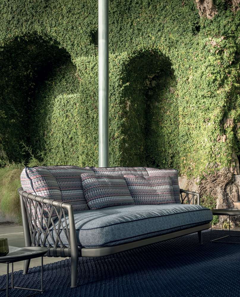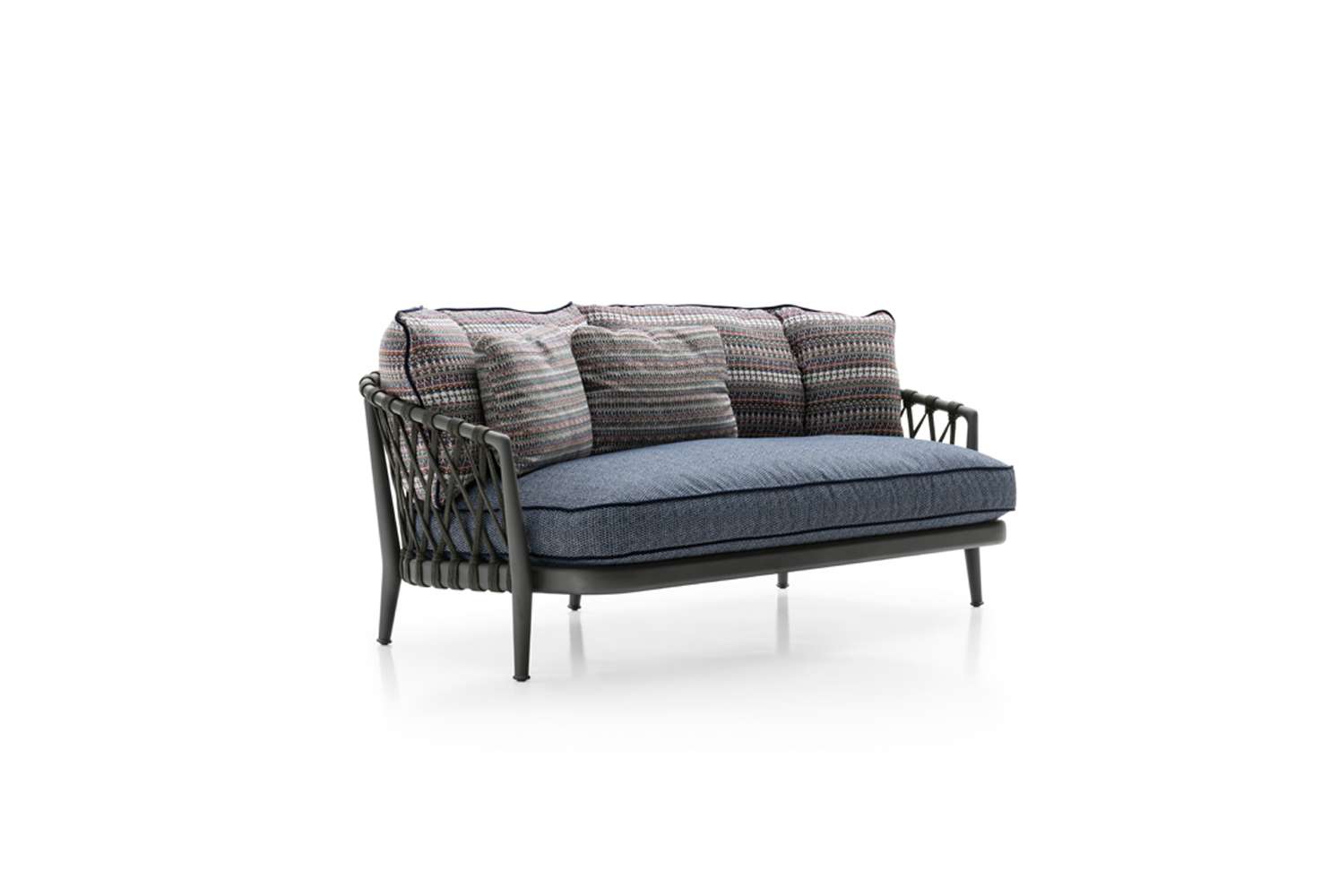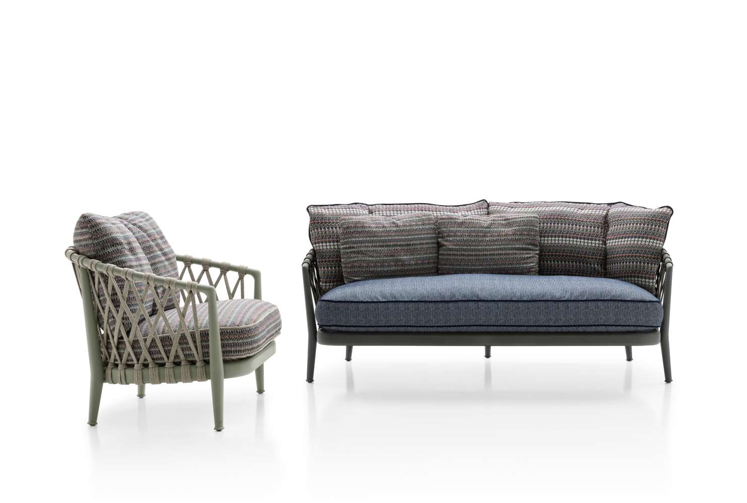 2017年に発表して好評を博したソファ、アームチェア、スモールチェアのEricaコレクションに、新しいソファが加わりました。これまでと同様に特徴的なカーブを描く背もたれとインターレースをベースにしながら、より深い座面と生活感のある外観を実現しています。ソファのサイズは、座面の深さが96cmの170cmと216cm、座面の深さが140cmの153cmの3種類で、クッションの張り地を変えることで、よりソフトでナチュラルな印象を与え、より魅力的なソファとなっています。ダブグレー、アンスラサイト、またはセージ色のフレームとナチュラル色のインターレースという珍しい色の組み合わせには、さまざまな色調とデザインのクッションカバーが用意されており、それぞれがコーディネートされています。また、革新的なインターレースを施した背もたれを持つアームレスト付きのチェアもあります。