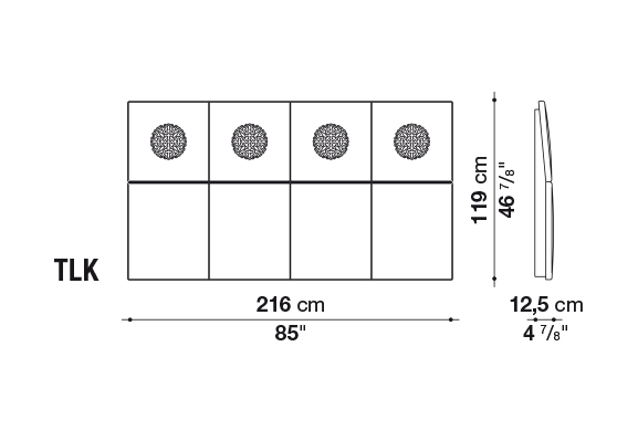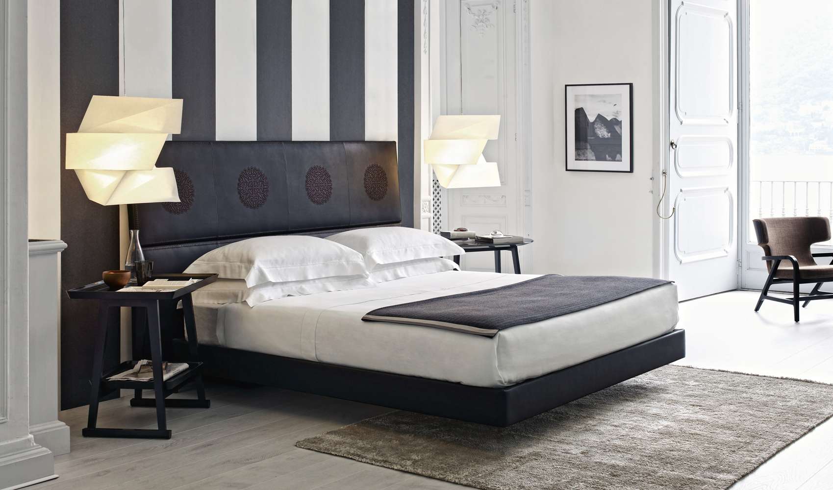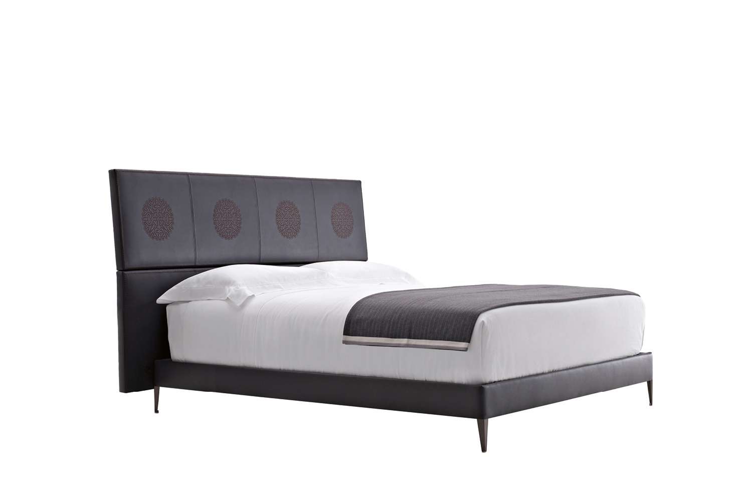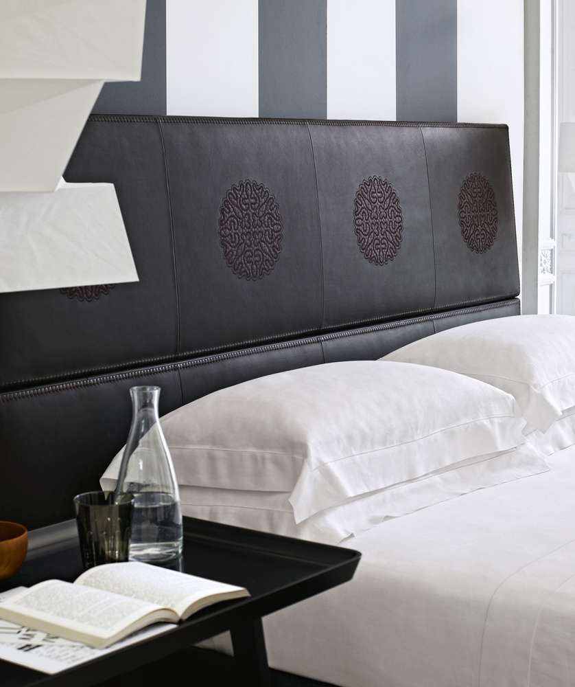 レザーベッドのプレステージ性を持ち、ミニマルなデザインでエレガントさを表現しています。ヘッドボード(高さが異なる壁掛け式)は2枚のパネルで構成されています。トップパネルはわずかに傾斜しており、本質的なデザインを和らげる装飾的な要素を備えています。丸いレースのモチーフがコントラストを生み、ヘッドボードの縁にブランケットステッチのボーダーを添えています。