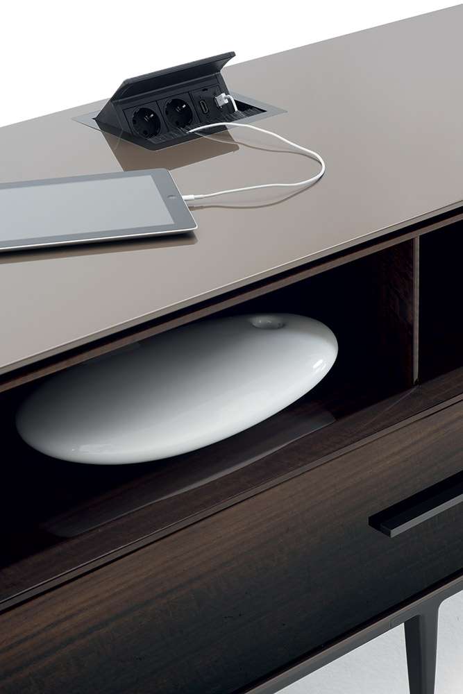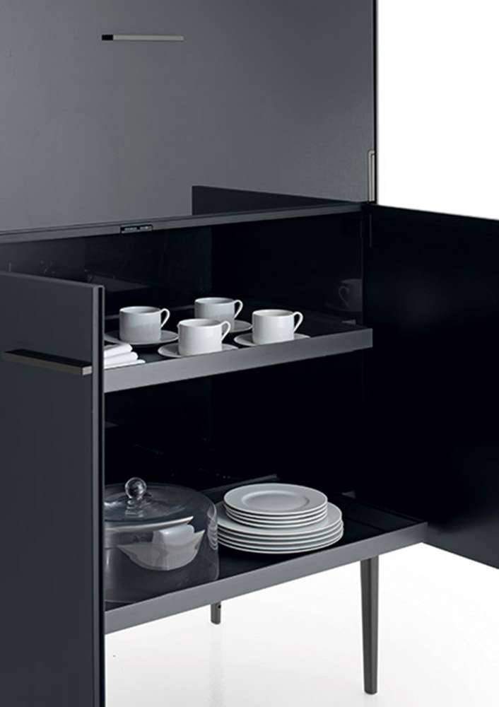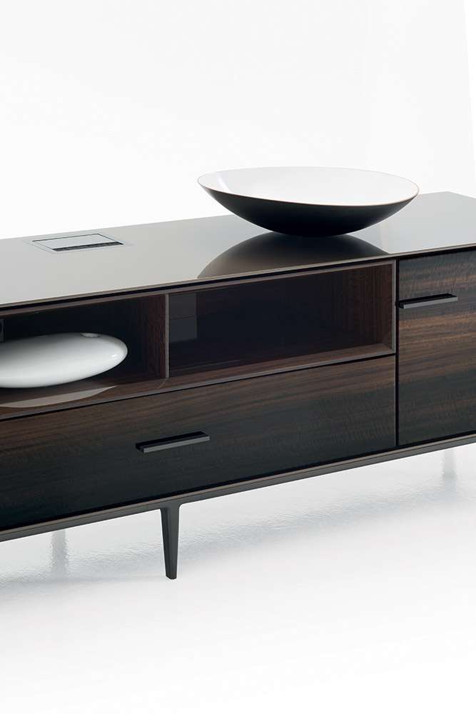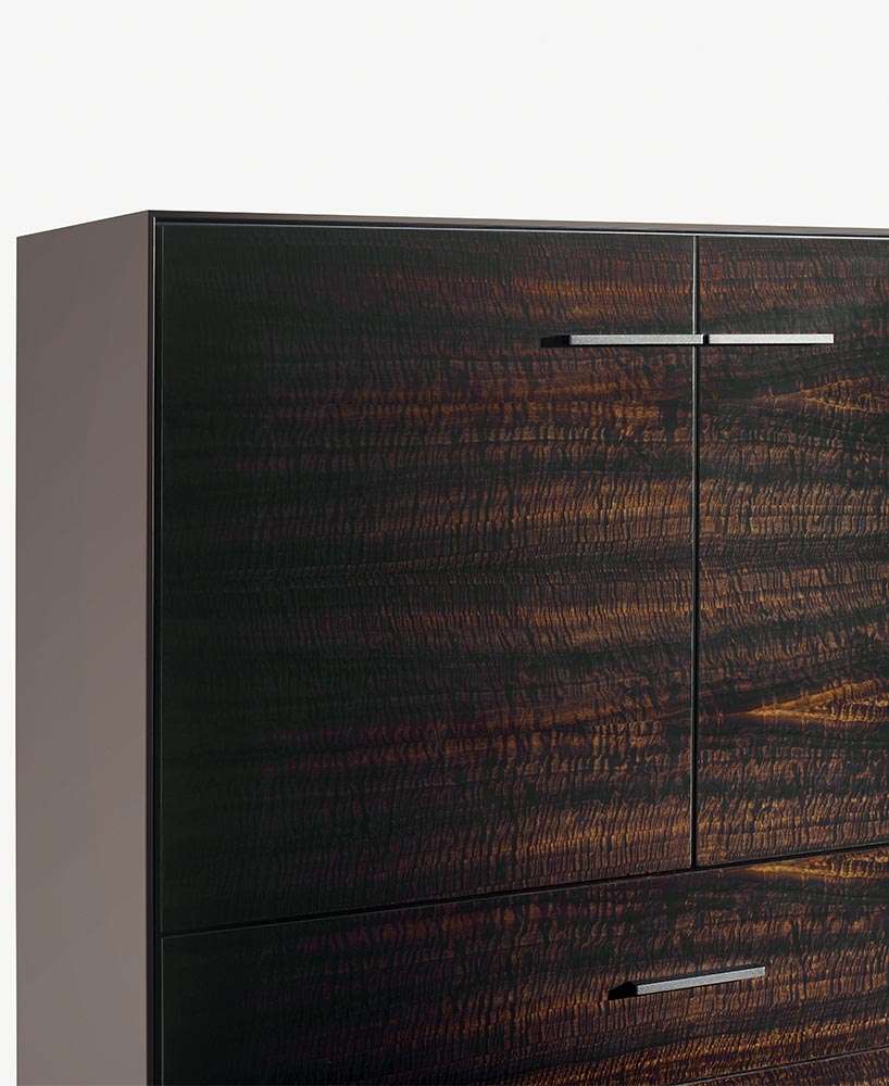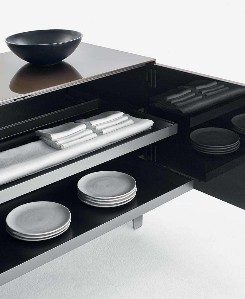 Eucalipto<ユーカリプト>はアントニオ・チッテリオによりデザインされたストレージユニットの総称であり、リビングルーム、ダイニングルームなど様々な空間でお使い頂けます。コージーテーブルと同じく、ユーカリプトは魅力的な組み合わせにより、B&Bコレクションをより一層華やかなものにしています。それが顕著に表れているのが、ブラックの内部と調和するドアや引き出しの3つの異なる外装バリエーションです。1つ目はブラックフレームのドアと引き出しであ り、グレーミラーガラス、ブラック塗装ガラス、光沢のあるユーカリプト材からお選び頂けます。2つ目はブロンズフレームのドアと引き出しであり、ブロ ンズミラーガラス、ブロンズ塗装ガラス、光沢のあるユーカリプト材からお選び頂けます。最後のオプションはティールブルーフレームのドアと引き出しで あり、グレーミラーガラス、ティールブルー塗装ガラス、光沢のあるユーカリプト材が用意されています。ユーカリプトストレージユニットを直接床に置い ても、ブラッククローム塗装若しくはピューター塗装の2種類の高さのダイキャスト台座に乗せても、スモーキーガラスの棚や取り外し可能なブロンズニッ ケル塗装のトレーは、陰影の妙味によりその価値を更に高めています。またユーカリプトの特徴として、背面に仕上げ材を併用することにより部屋の中心に 置いてパーテーションとしても使えることが挙げられます。