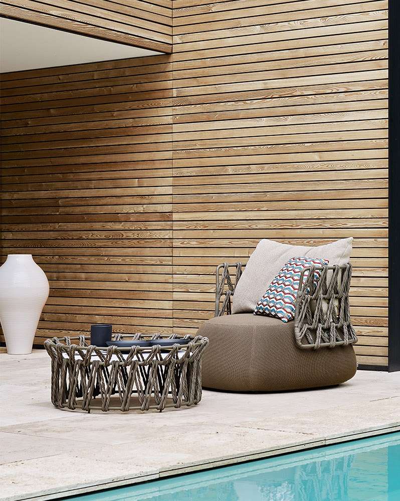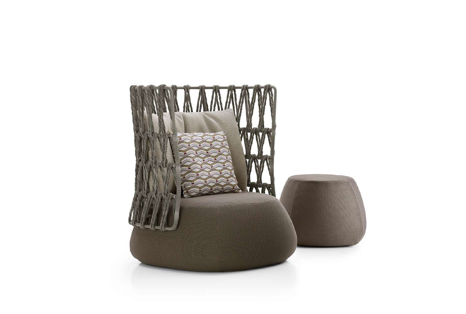 アウトドア仕様のFat-Sofa Outdoor<ファットソファ アウトドア>は、その柔らかな丸みを帯びた形状に加えて編込みがデザインされたことにより斬新になりました。一体型シートとメタルフレームに編込みをほどこしたバックレストが組み合わさることにより、ボリューム感と開放感の相反する2つの印象を同時に味わうことが可能となります。トルトーラカラーのポリエチレンファイバーでできた編込みパターンはとてもユニークでデザイナーが表現したかった“軽さ“と”透過性”は、あらゆる空間との調和を実現しました。タイプは、ソファが2サイズ、ハイバックとローバックのアームチェア、オットマンが2サイズの全部で6種類となります。