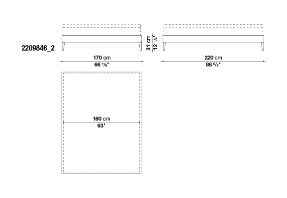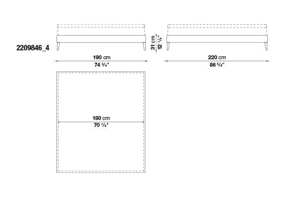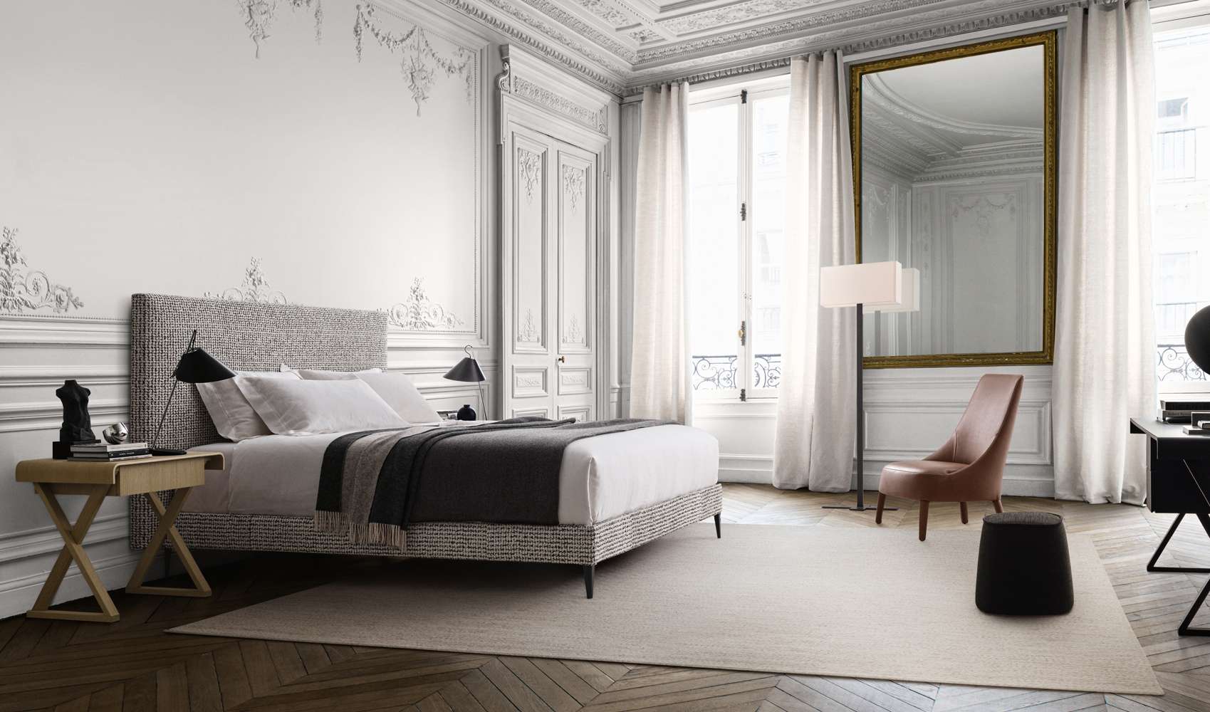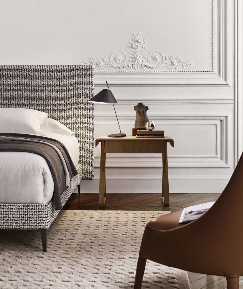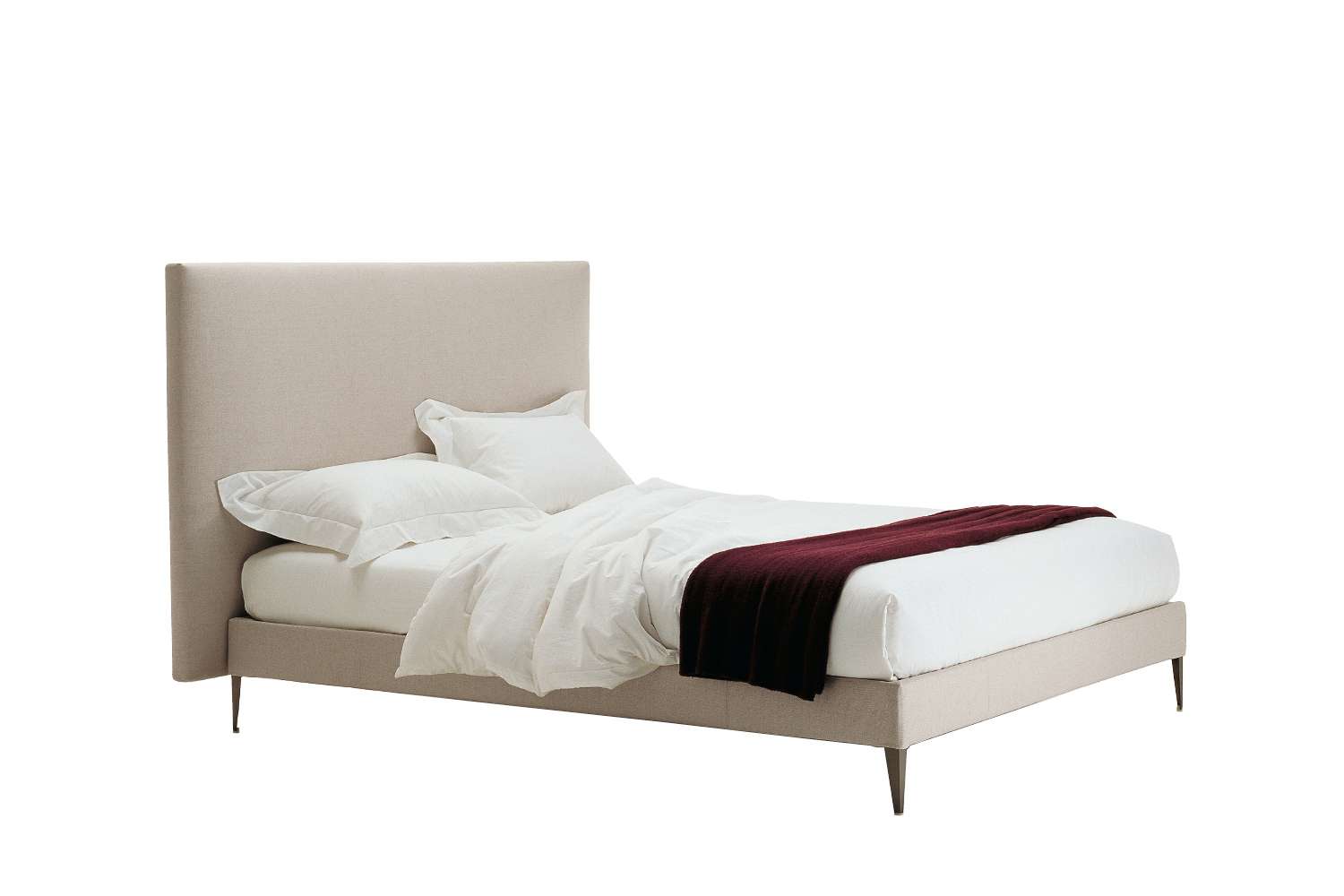ベースの幅は4種類あり、張りを施したヘッドボードをウォールフォームに固定する実用的で非常に洗練されたベッドです。脚部には明るいクローム、ブロ ンズニッケル塗装のスチール、またはグレーオーク、つや消しのライトオーク、つや消しのブラックオークを用意しています。