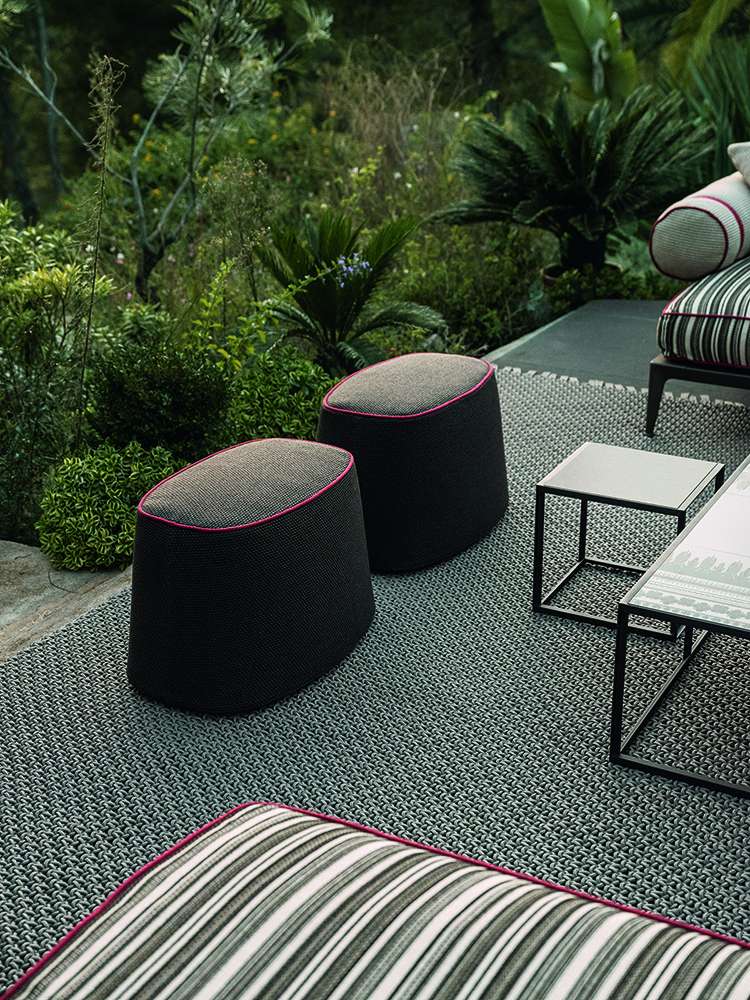 このアウトドア用のFrank Outdoor<フランク アウトドア>オットマンは、カラフルなアウトドア用の生地とマッチする色のアクセントを屋外に提供するためのコントラストのあるプロファイルを持っています。