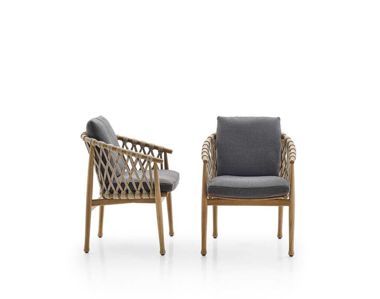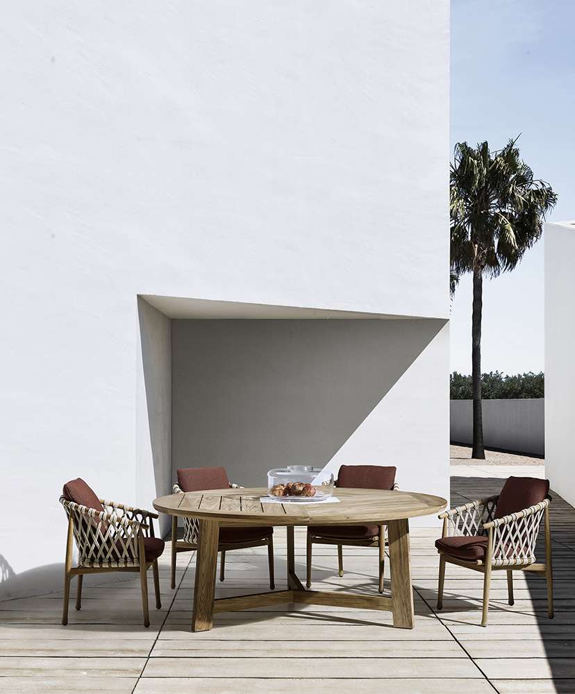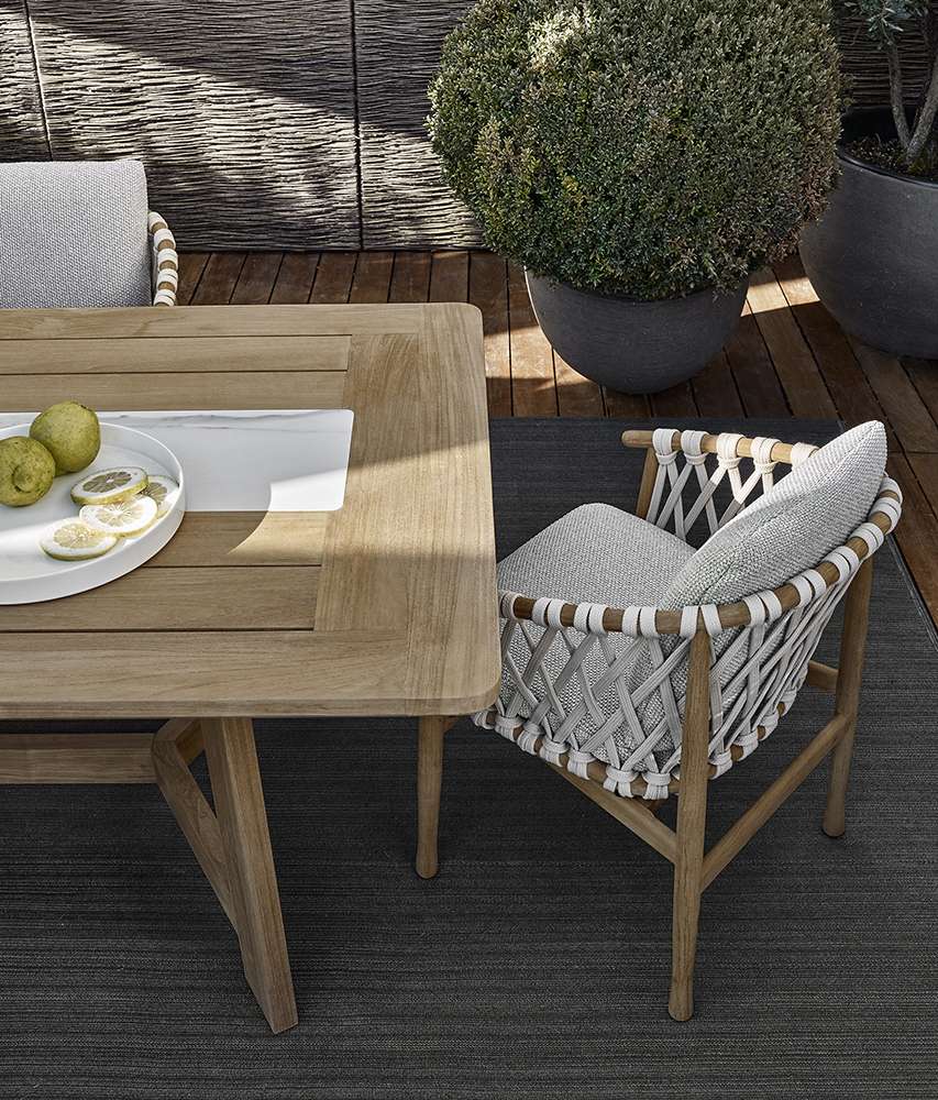このシリーズにはしなやかな曲線が特徴的な椅子も用意されており、北欧のデザインの影響を受けていることが見て取れます。構造部分にはチーク無垢材が用いられており、ポリプロピレンファイバーのベージュ色の編み込みが美しさを際立たせており、柔らかいシートとバッククッションが快適な座り心地を保証します。