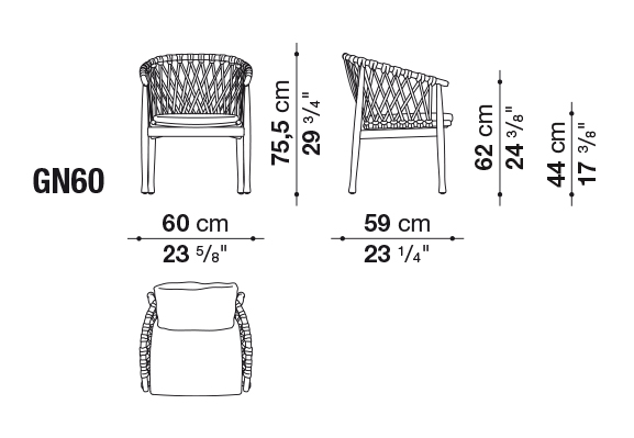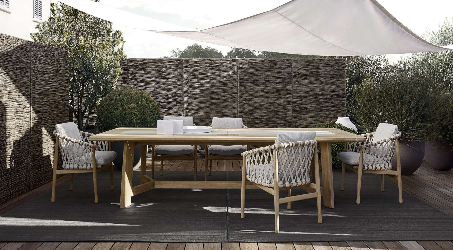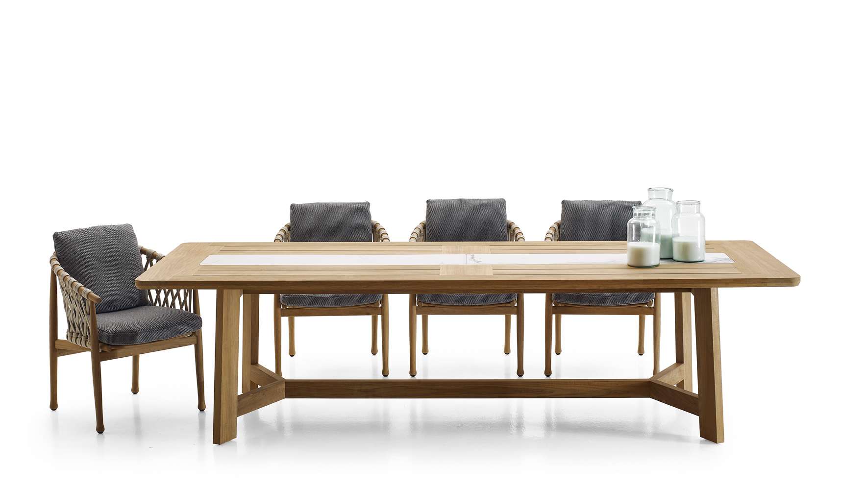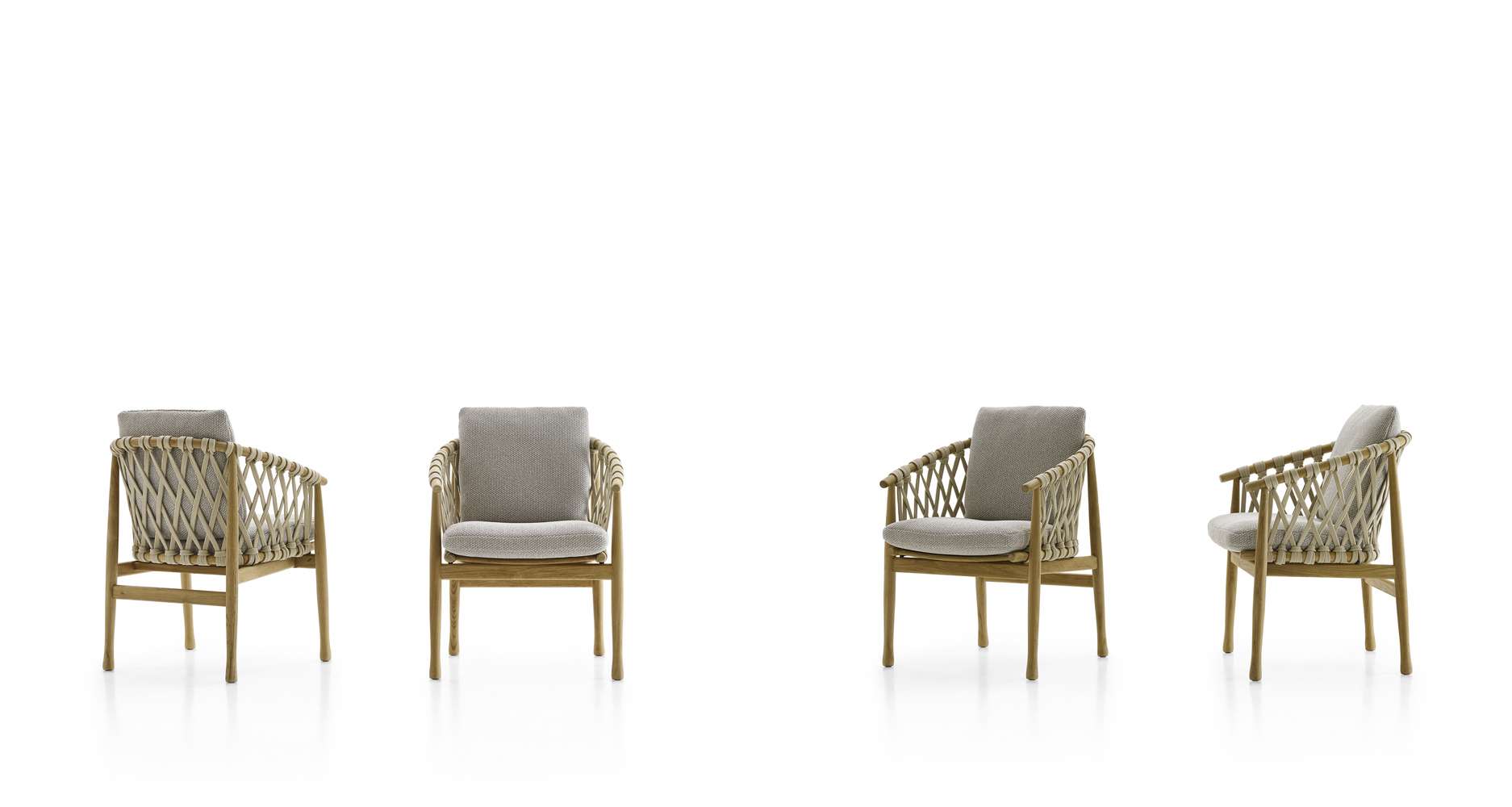 このシリーズにはしなやかな曲線が特徴的な椅子も用意されており、北欧のデザインの影響を受けていることが見て取れます。構造部分にはチーク無垢材が用いられており、ポリプロピレンファイバーのベージュ色の編み込みが美しさを際立たせており、柔らかいシートとバッククッションが快適な座り心地を保証します。