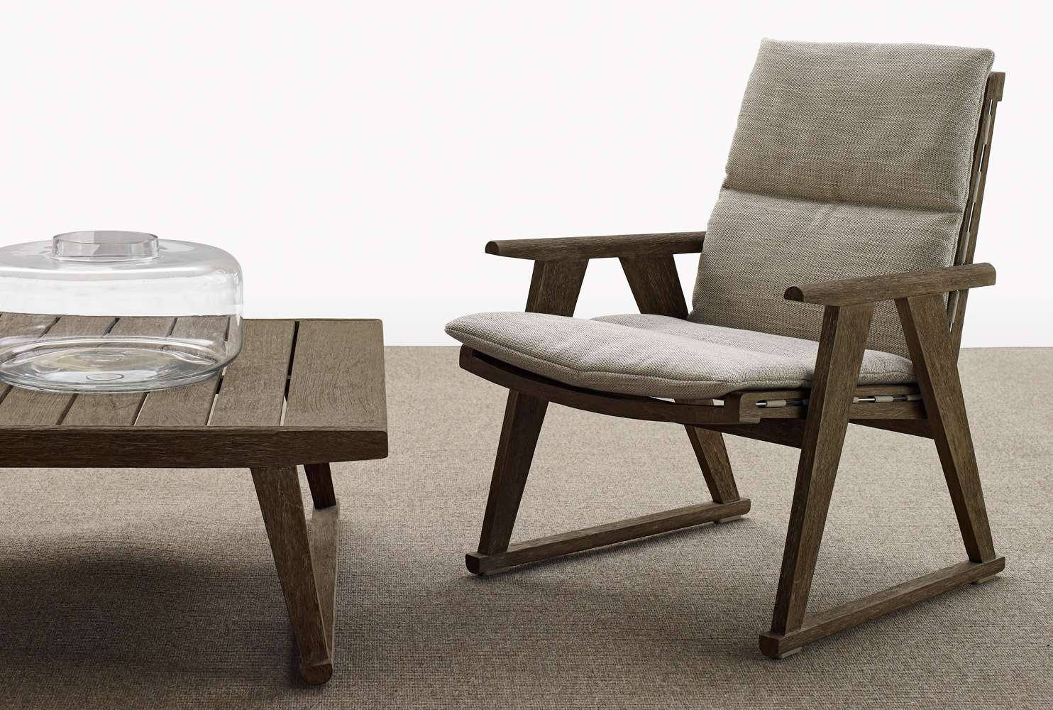 アントニオ・チッテリオがデザインしたGio<ジオ>は、屋外での生活に特化した、コンテンポラリー・クラシックなアクセントを持つシリーズです。ソファ、エンドユニット、シェーズロング、サンベッド、アームチェア、チェア、テーブル、コンプリメントの各シリーズは、チークの無垢材にアンティークグレーの特殊仕上げを施したもので、この仕上げは、木材独特の経年変化後のようなシルバーグレーの質感を与えます。また、風雨からの遮断性を高めるために、パッド部分には防水加工を施したポリエステル製のカバーを使用しており、その生地は耐候性、紫外線、塩素、潮風に対する耐性を備えています。
