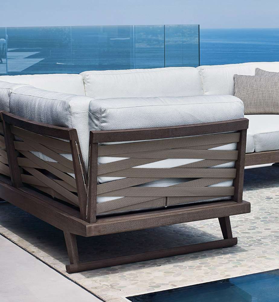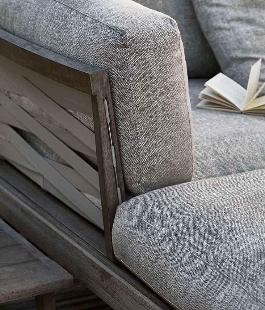 ジオは、屋外のリビングに特化した新しいシリーズで、クラシックなアクセントを現代的に施しました。ソファ、エンドユニット、シェーズロング、サンベッド、アームチェア、チェア、テーブル、付属品など、すべての要素を取り揃えています。特殊なアンティーク風グレー仕上を施した硬いチーク材の構造部から構成され、木材に独特のあたたかみとシルバーグレーの反射性を加えています。さまざまなタイプのソファ、エンドユニット、シェーズロングでシーティングは直線的にも、コーナーやペニンシュラ形にも組み合わせられます。すべて、ウッドスラットを使った基本構造で、特徴的なベージュの帯で結ばれた背もたれや肘掛けを簡単に組み込むことができます。さまざまなコンポーネントを簡単に取り外すことができる独特の構造なので、冬季に製品を保管しておくためのスペースも節約できます。天候への耐性を確実にするため、パッド部分にはすべて防水加工を施したポリエステルのカバーをつけ、ファブリックにも耐候性、耐紫外線性、耐塩素性、耐海水性を持たせてあります。