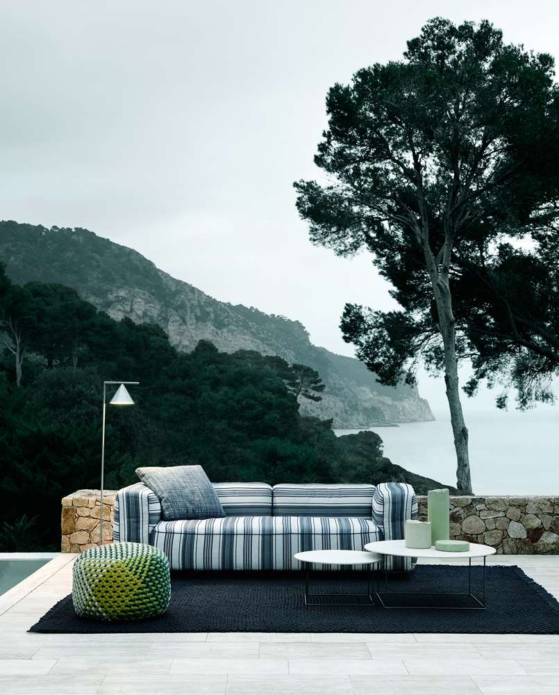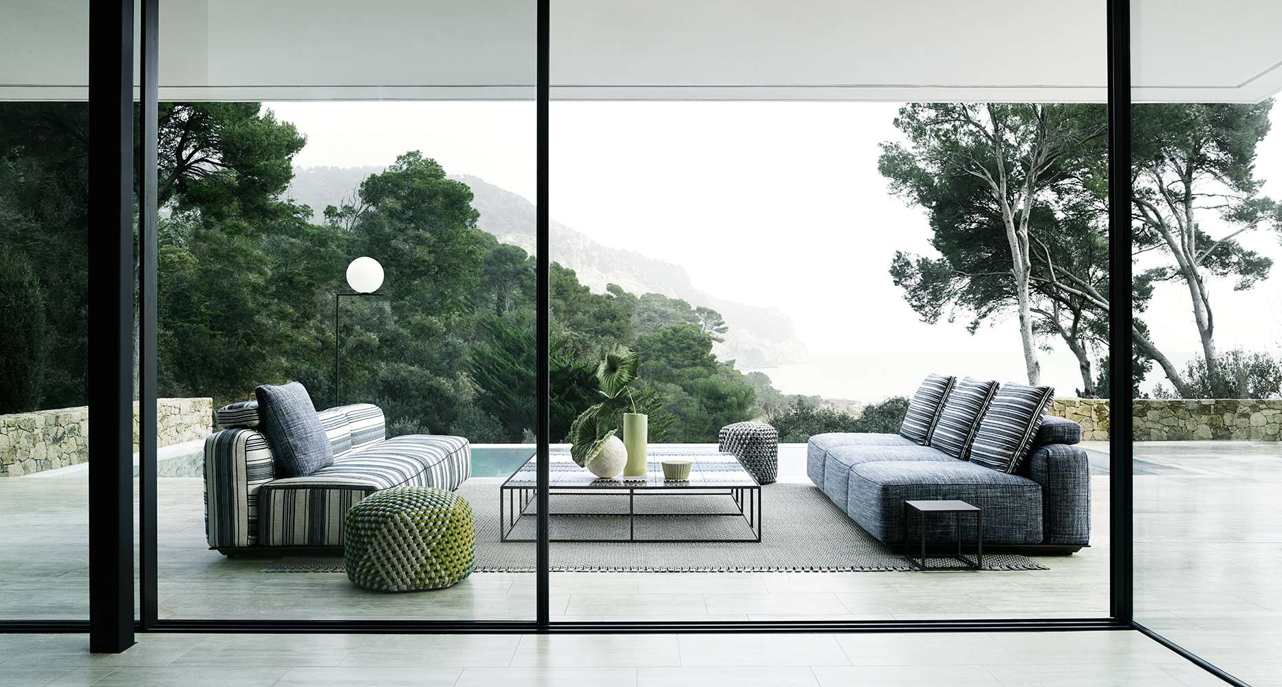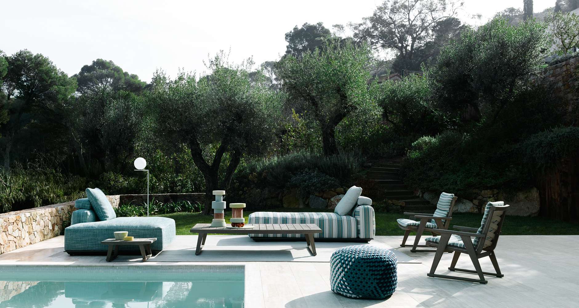 相反するものは見た目だけではなく、その感触にも表れますが、Hybridはインドア用の伝統的装飾家具にある快さ、安心感をアウトドア用に実現化させてみせました。それは新しく開発されたマットレスシートのおかげで、クッションは密度の異なるパッド(詰め材)で作られ、快く体を受け入れ同時に沈むことなく支えられるよう慎重にデザインされています。支えの構造はほぼ見えず、シートも床から数センチ浮いているように見えます。強固な基台はセージ、クレイ、アンスラサイト色に塗装された押出成形のアルミフレームで形成され、ファイバーグラス製のスラットを施したプラットフォームでできています。バックレストは、柔らかいポリウレタンに包まれたアルミ構造が中に隠れ、パッドの入った覆いに包まれたうえ、最終的に防水処理を施されたファブリックで完結されています。