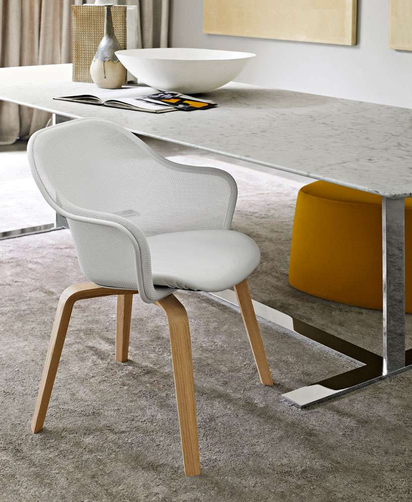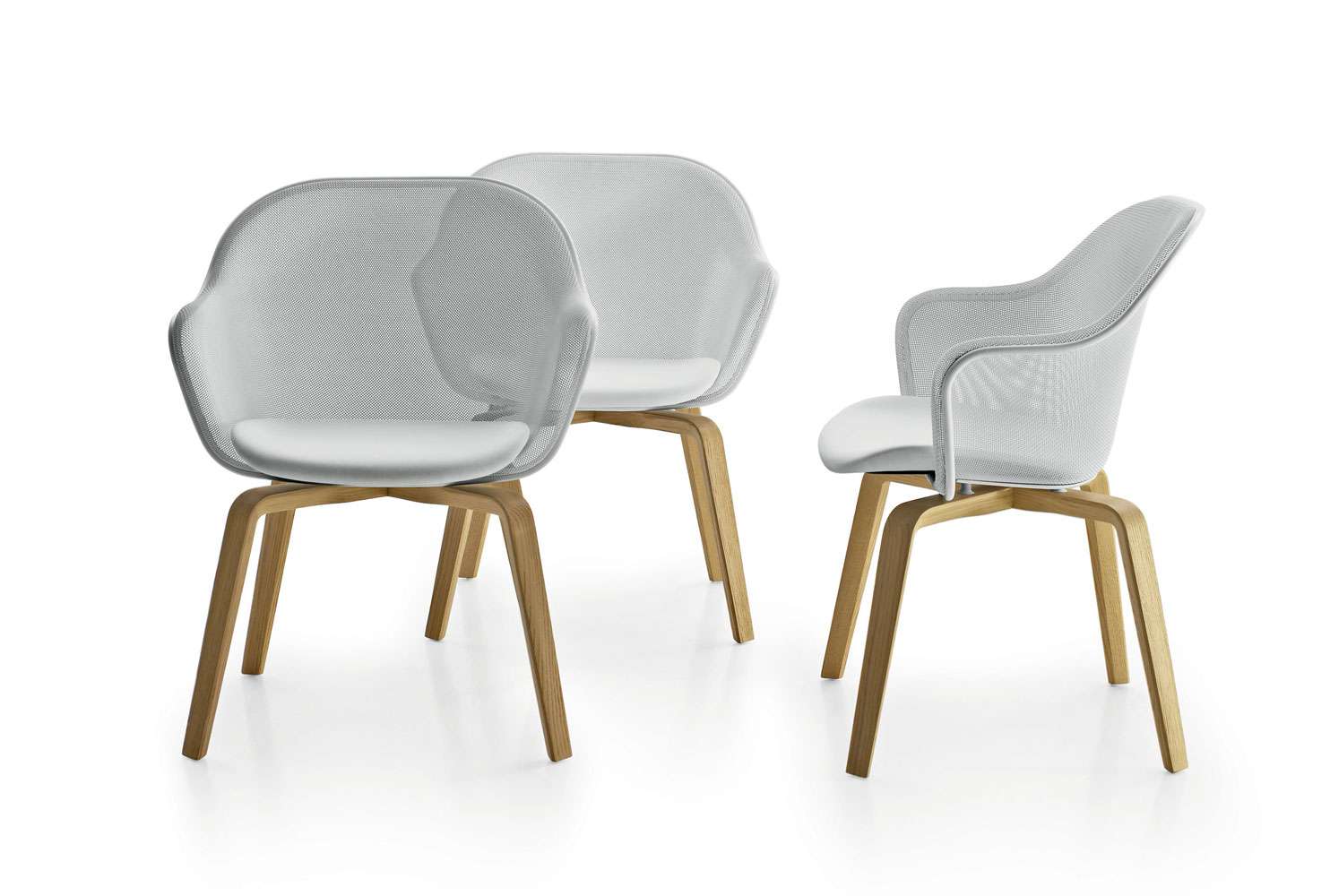 Iuta'14<イウタ'14>のスモールアームチェアは、ホームとオフィスの両方にエレガントなソリューションをもたらします。アルミニウム製の外縁が描く柔らかなラインはそのままに、脚部を木製にした新バージョンが加わり、デザインの幅が広がりました。