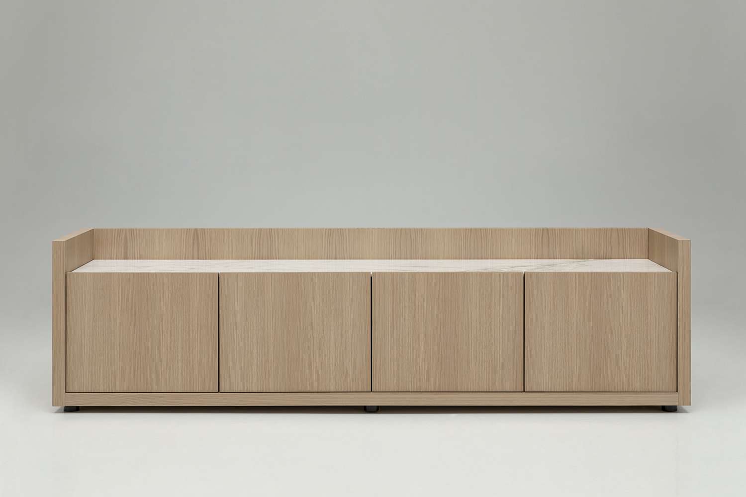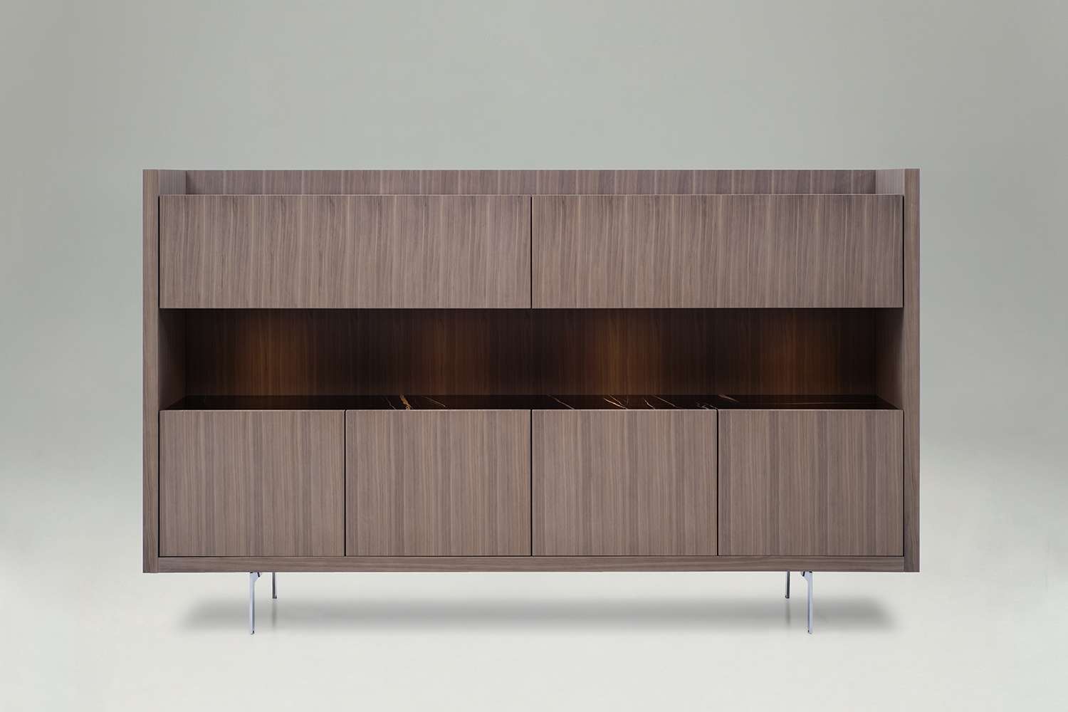ピエロ・リッソーニがB&B ItaliaのためにデザインしたLiagòは、ダイニングやリビングに最適な新しい収納ユニットのシリーズです。このコレクションは、扉と引き出しを備えた2つのローストレージユニットと、ヒンジ式とフラップ式の扉を備えた1つのハイストレージユニットで構成されています。Liagò(リアゴ)とは、ベネチアの伝統的な建築様式で、木製の屋外ロジアで、床には大理石が使われています。この場所は、空間と時間が宙に浮いたような場所であり、ラグーンハウスが息を吹き返し、太陽の光を取り入れることができる貴重で希少なエリアです。ピエロ・リッソーニは、このクラシックなものから出発し、フレームや素材はそのままに、新たな用途と最新の役割を持つように再解釈しました。すっきりとしたラインと印象的な厚さが、この建築にインスパイアされたコレクションを特徴づけています。建築物のように、50mmの厚さのフレームには機能的な魂が隠されています。サイドパネルとバックパネルを組み立てると、その中にコンパートメントができ、電気ケーブルなどを通すことができます。つまり、Liagòのストレージユニットには、テレビ、モニター、ランプ、スピーカー、アンプ、ウェザーステーション、家庭用音声アシスタントなどの有線機器の電源供給や接続が可能なのです。これを可能にしているのが「フォールディング」、つまり木のパネルをカットして折り目を再現するという建築技術で、天板とエッジの接合部を見えなくすることで、ユニット全体に木目を連続させ、見苦しい中断を避けることができます。このコレクションの家具は、床に直接置くことも、エレガントな調節可能なスチール製の足の上に置くこともできます。素材はブラッシュドライトオーク、ライトカナレットウォールナットで、生成りまたはグレーの効果があります。また、18色の光沢仕上げとサテン仕上げのラッカー仕上げもあり、それぞれの家具のスタイルを根本から変えることができます。上部天板は、木、ラッカー、カッラーラホワイト大理石、サハラノワールブラック大理石があります。内装は、洗練されたシルクのような、傷や指紋がつきにくい無煙炭素材で覆われています。内部の棚板にはエッチング加工されたスモリガラスが使用されています。引き出しは、信じられないほど薄いフレームを採用しています。B&B Italiaでは、この革新的な製品のプレビューを提供しています。Liagòは、内部照明システムを装備することができ、高さのある収納ユニットのオープンコンパートメントにも対応しています。また、グレーのカナレットウォールナット材を使用した取り外し可能なトレイなどの追加要素を加えることで、どのような環境のスタイルやテイストにも適した家具にすることができます。このプロジェクトでは、水平方向のエッジに施されたソフトシール、コンシールドヒンジ、ヒンジと隠し機構を備えたフラップ開口部などのディテールを採用しています。これらは洗練されていながらも控えめな要素であり、高度な技術的ソリューションを隠し持った安心感のあるオブジェとなっています。