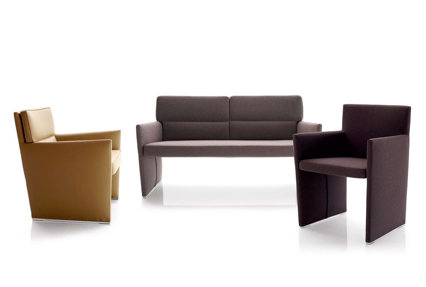 Posaには、ソファ、アームチェア、スモールアームチェアの3タイプがあります。Posaシリーズは、Friedrich Schiller(フリードリヒ・シラー)のオペラ「Don Carlos」に登場する理想的なヒーロー、Marquis Von Posa(ポサ侯爵)にちなんで名付けられました。シラーはドイツのマルバッハ・アム・ネッカーで生まれましたが、そのマルバッハ・アム・ネッカーには最近、デビッド・チッパーフィールドが設計した近代文学博物館があります(2006年完成)。チッパーフィールド氏の作品は建築物からインスピレーションを受けることが多く、Posaも例外ではありません。すっきりとしたラインが特徴的なこのシーティングソリューションは、隠れたフレームをファブリックやレザーで完全に覆っています。