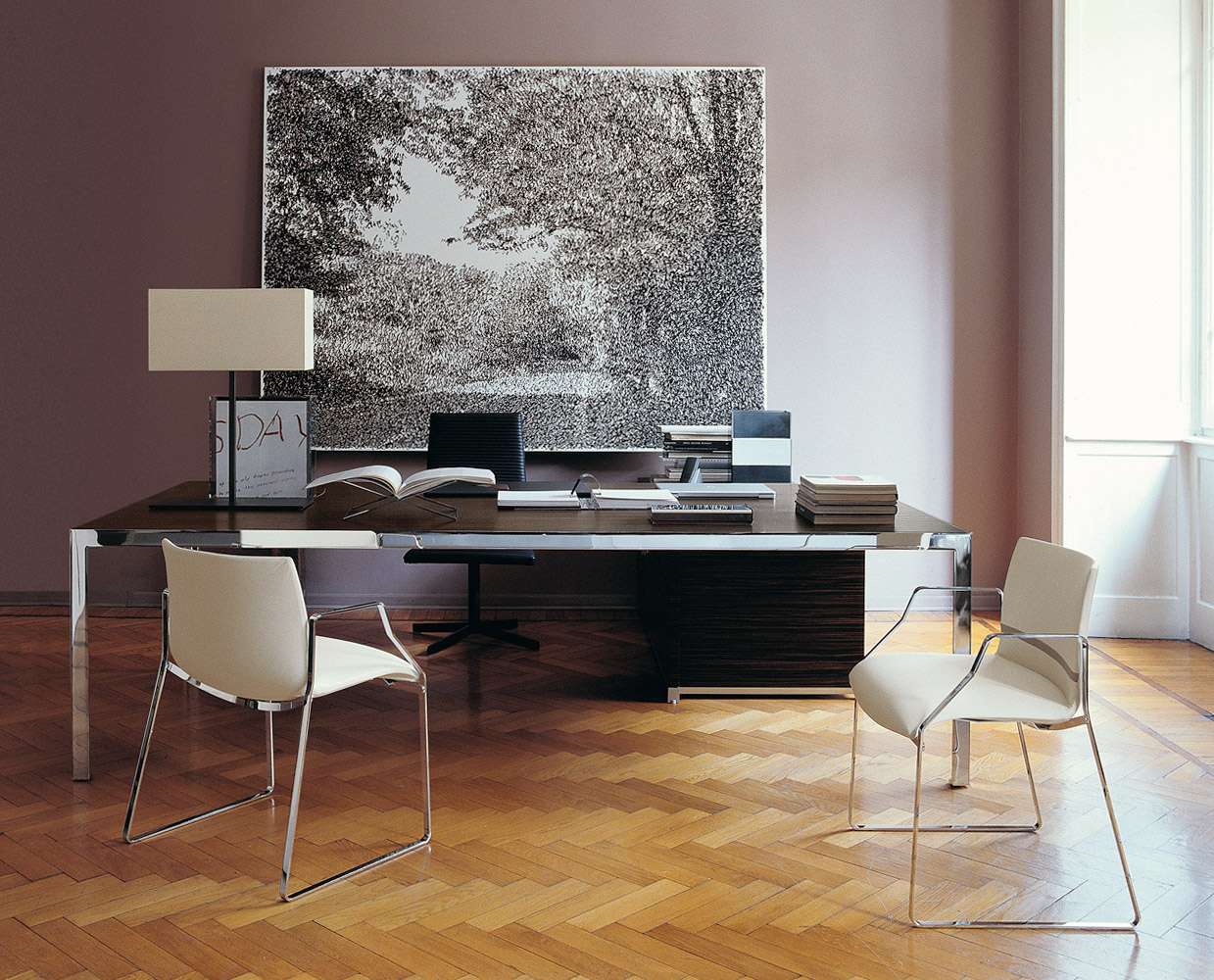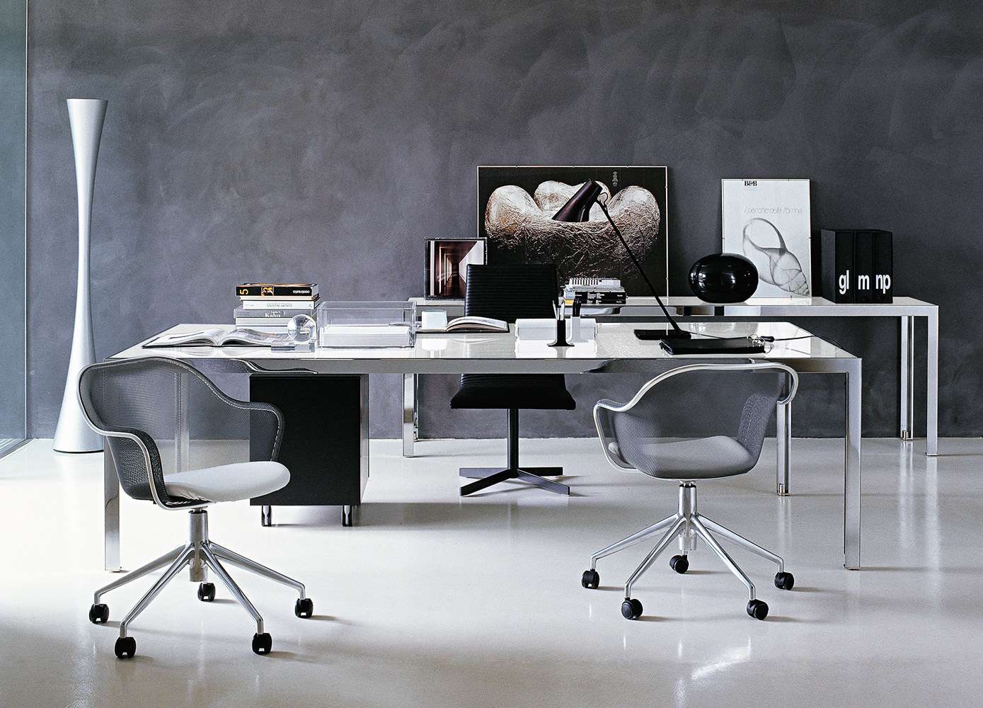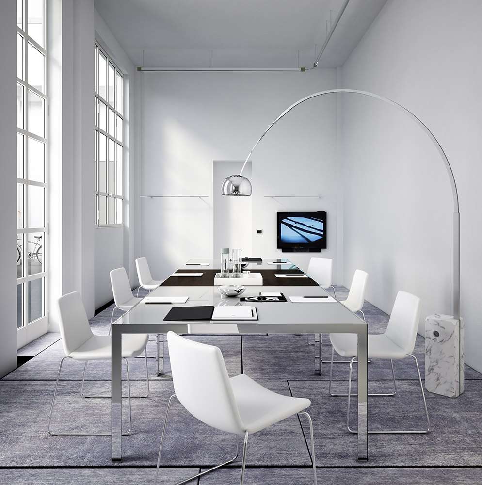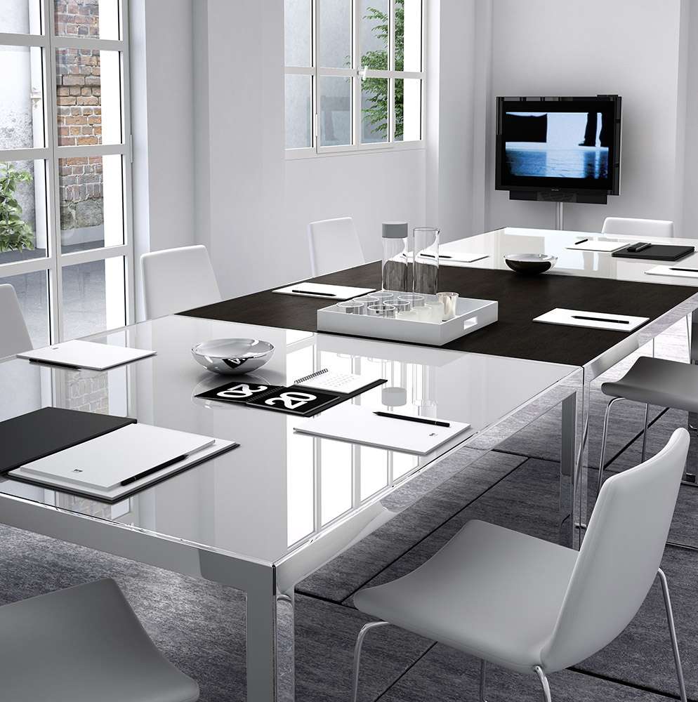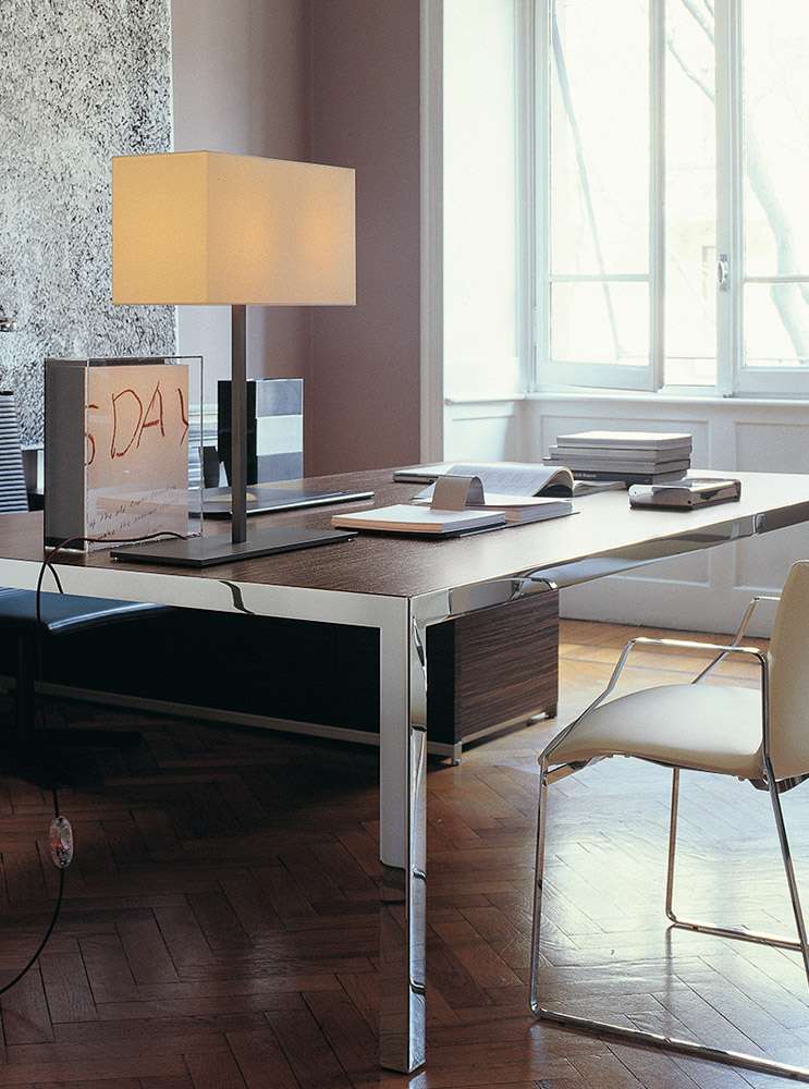 Progetto 1<プロジェット ウノ>は、洗練されたワークステーションやエグゼクティブオフィス、会議室などで使用することを目的とした、ピュアで厳格なデザインのテーブルコレクションです。さまざまなサイズが用意されており、細部へのこだわりと幅広い構成の可能性が特徴です。クローム仕上げのスチール製の構造体に、木製またはガラス製の天板を組み合わせ、棚板やケーブルホルダーを装備することができます。