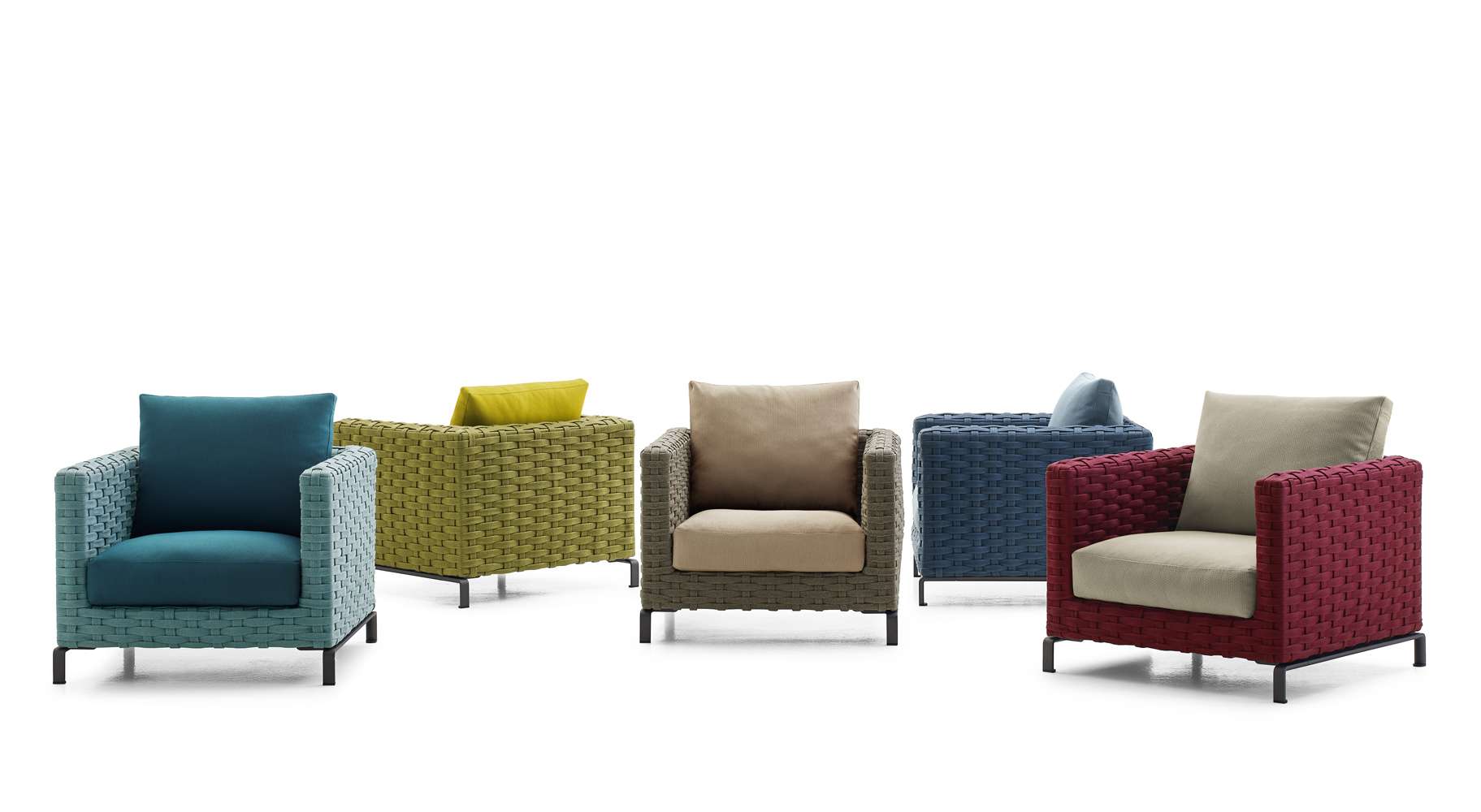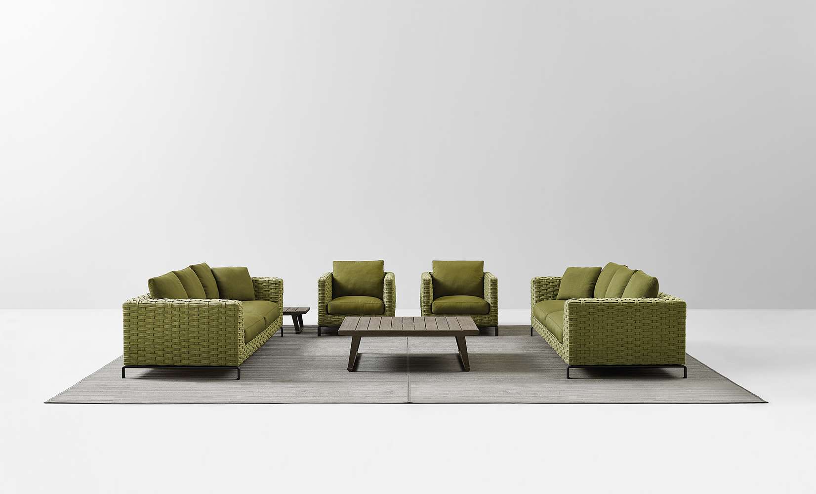 インドアコレクションとしての名声を得た後、アントニオ・チッテリオはRAY<レイ>シーティングシステムに二つの新しいアウトドアコレクション“ファブリック"と"ナチュラル”を採用しました。両コレクション共に軽量な押し出しアルミニウムフレームを使っていますが、違った素材で編み込みを施している所は異なります。ファブリックコレクションは“リボン”織り技術が特徴であり、紫外線や風雨等自然の力による経年変化に抵抗力があります。カラーはターコイズ、ブルー、アシッドグリーン、トルトーラやボルドーと、幅広くご用意しています。両コレクションには二種類の奥行きを持つソファがあり、アームチェアーやシェーズロング等のエレメントが用意されています。またサンベッドはファブリックコレクションのみの商品となります。