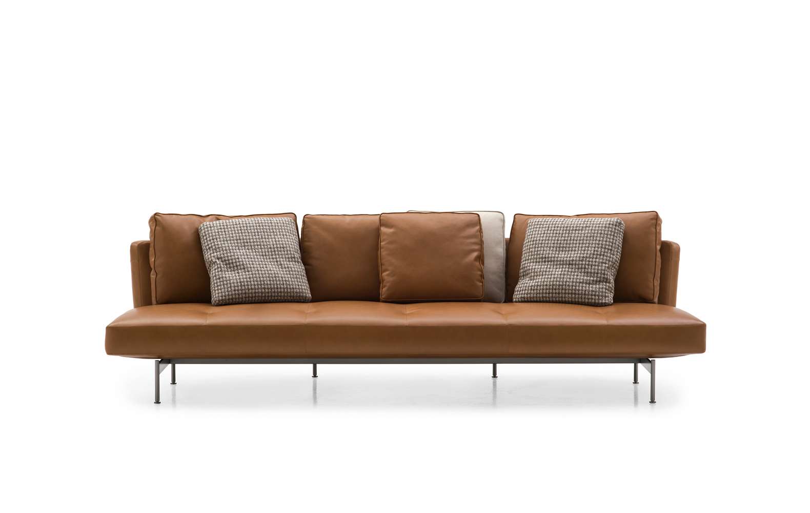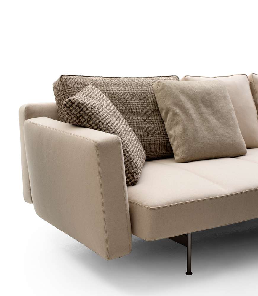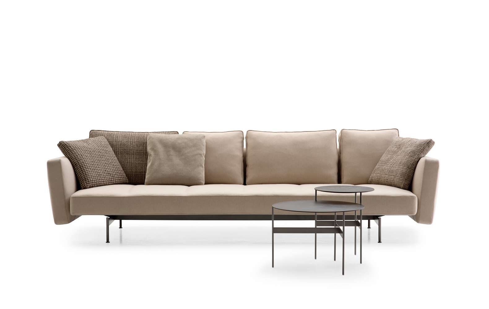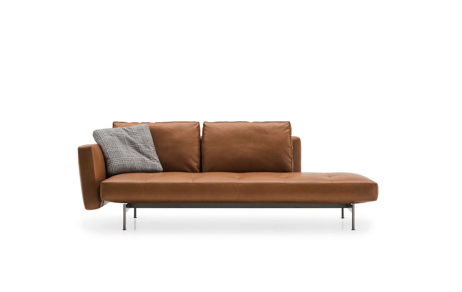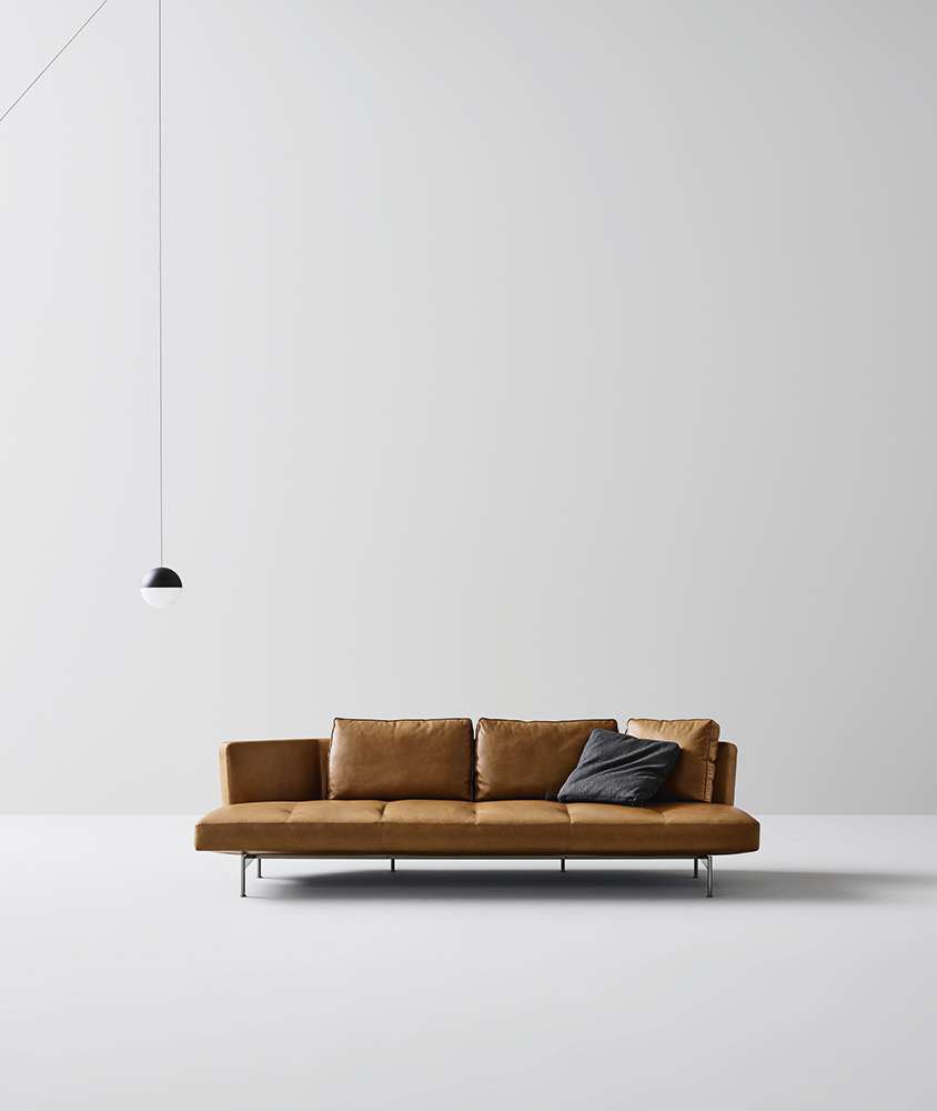 初めてB&B Italia のためにデザインされたソファSAKé(酒)、ここからB&B Italiaとピエロ・リッソーニとのコラボレーションが始まります。コンテンポラリーな印象のシーティングシステムは、緻密な研究を基に斉整たるバランスに仕上げられ、他の製品と明確な差別化がされています。囲い込むような形状と直線的なシートバック、そして豊富なサイズ展開は、置かれる空間に調和し趣向に合せた選択を可能とさせています。また、単体でも十分に美しさを表現するシェーズロングは、他のエレメントと組合わせることでバリエーションを拡げたり、並置することでより深く快適なソファを形造ることも可能とします。シートクッションには35cmまたは45cm間隔に洗練されたモジュラーステッチが施され、背部にはパイピングで縁取りされた2サイズのバッククッションがゆったりとした心地よさを演出します。さらに、B&B Italiaのコレクションで唯一ソファベッドが存在し、簡単なシート移動操作とバックレストを倒すことによりソファがベットに変貌します。左右どちらかを選択できるアームレストはヘッドボードの役割を果たします。シーティングシステムの基壇にはピューター塗装が施されたクロスバーに棒状のスチール脚が取付けられ、このソファ全体のデザインをより軽やかにみせています。