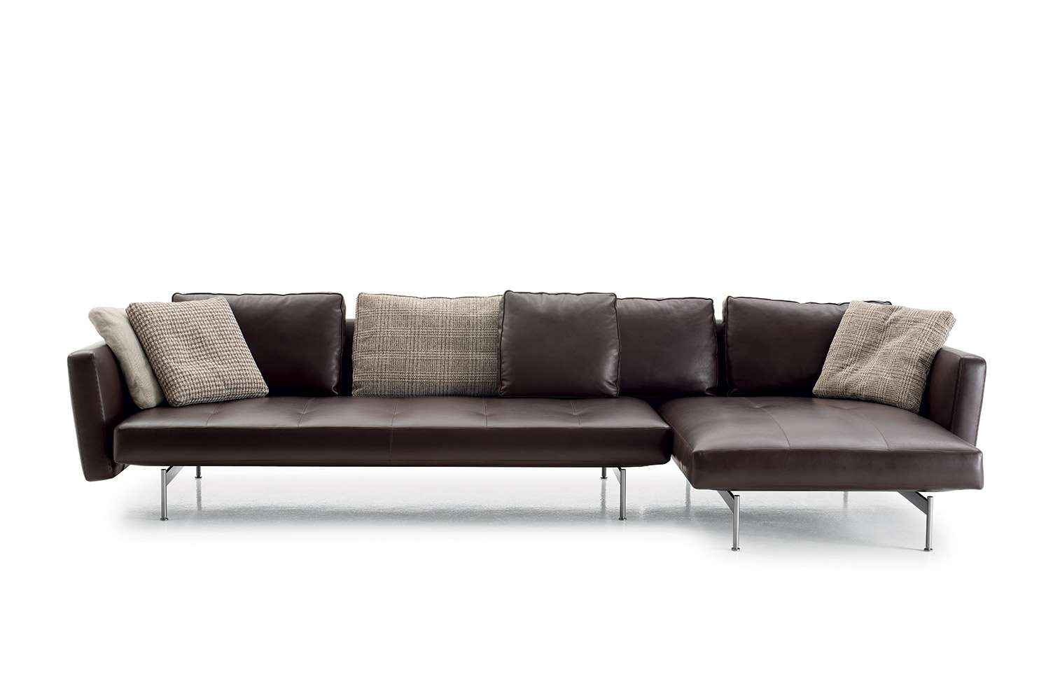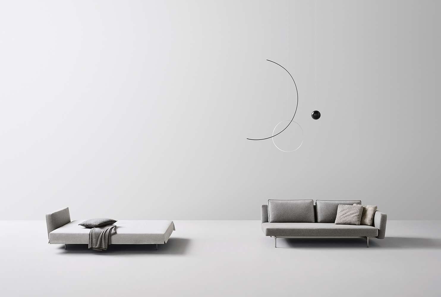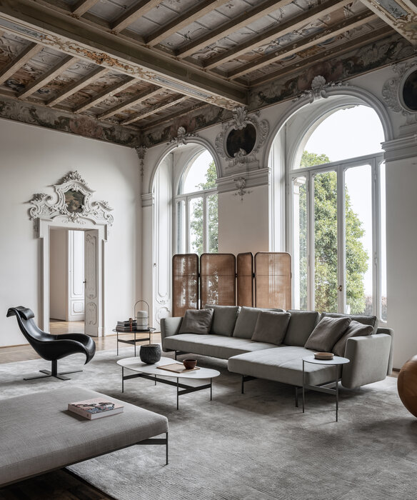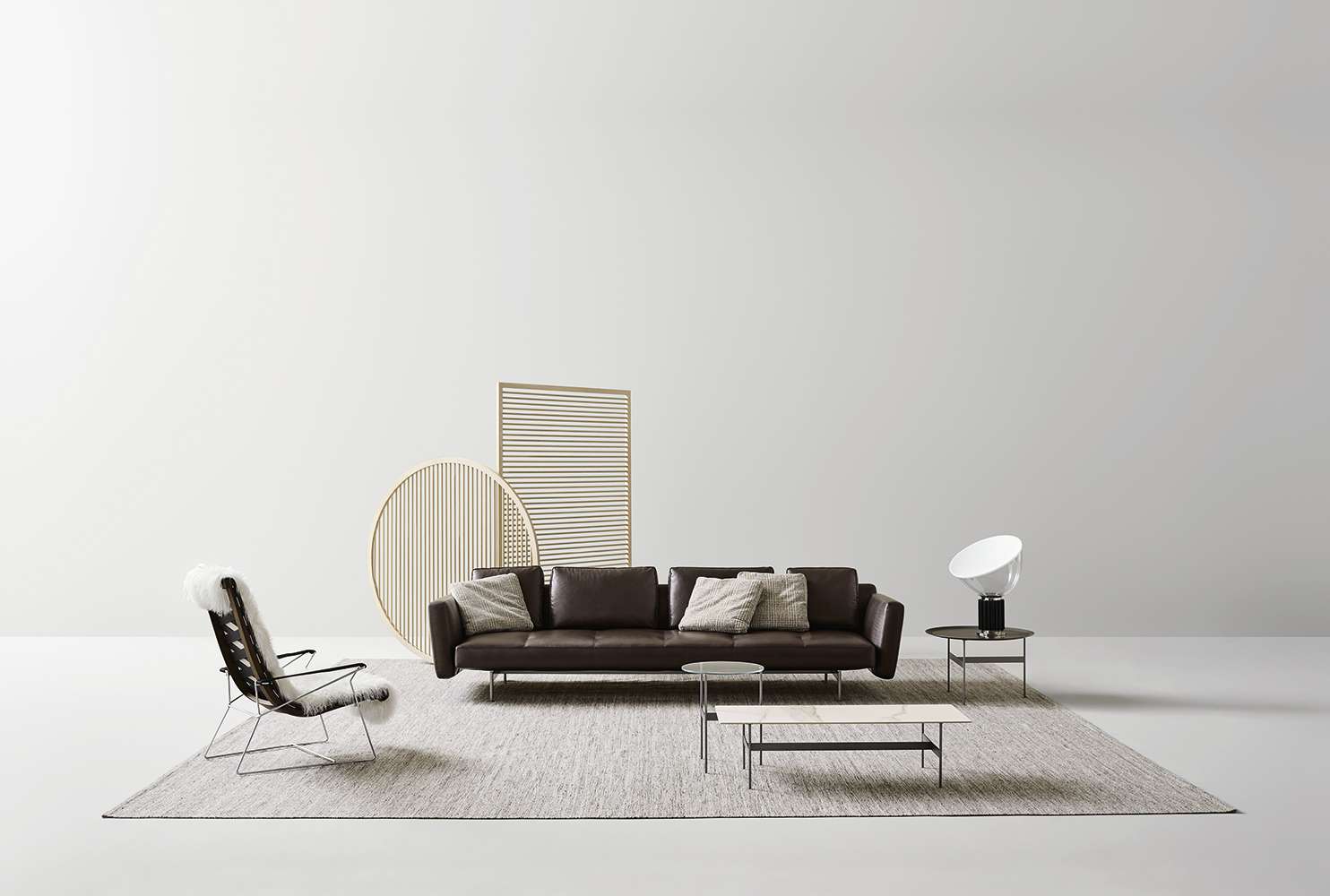 初めてB&B Italia のためにデザインされたソファSAKé(酒)、ここからB&B Italiaとピエロ・リッソーニとのコラボレーションが始まります。コンテンポラリーな印象のシーティングシステムは、緻密な研究を基に斉整たるバランスに仕上げられ、他の製品と明確な差別化がされています。囲い込むような形状と直線的なシートバック、そして豊富なサイズ展開は、置かれる空間に調和し趣向に合せた選択を可能とさせています。また、単体でも十分に美しさを表現するシェーズロングは、他のエレメントと組合わせることでバリエーションを拡げたり、並置することでより深く快適なソファを形造ることも可能とします。シートクッションには35cmまたは45cm間隔に洗練されたモジュラーステッチが施され、背部にはパイピングで縁取りされた2サイズのバッククッションがゆったりとした心地よさを演出します。さらに、B&B Italiaのコレクションで唯一ソファベッドが存在し、簡単なシート移動操作とバックレストを倒すことによりソファがベットに変貌します。左右どちらかを選択できるアームレストはヘッドボードの役割を果たします。シーティングシステムの基壇にはピューター塗装が施されたクロスバーに棒状のスチール脚が取付けられ、このソファ全体のデザインをより軽やかにみせています。