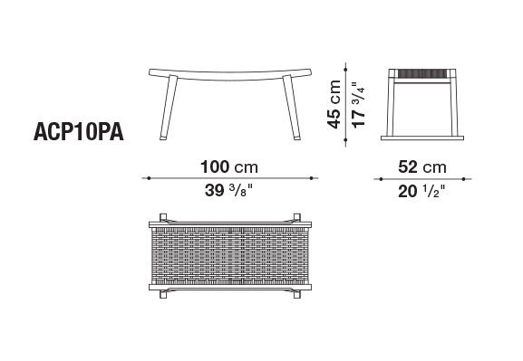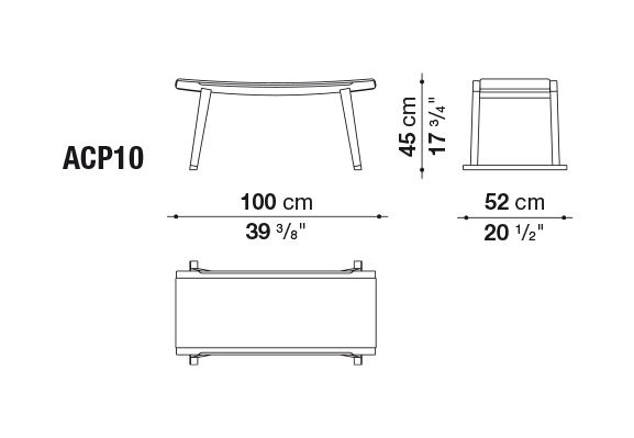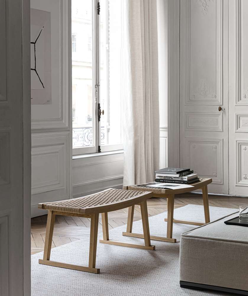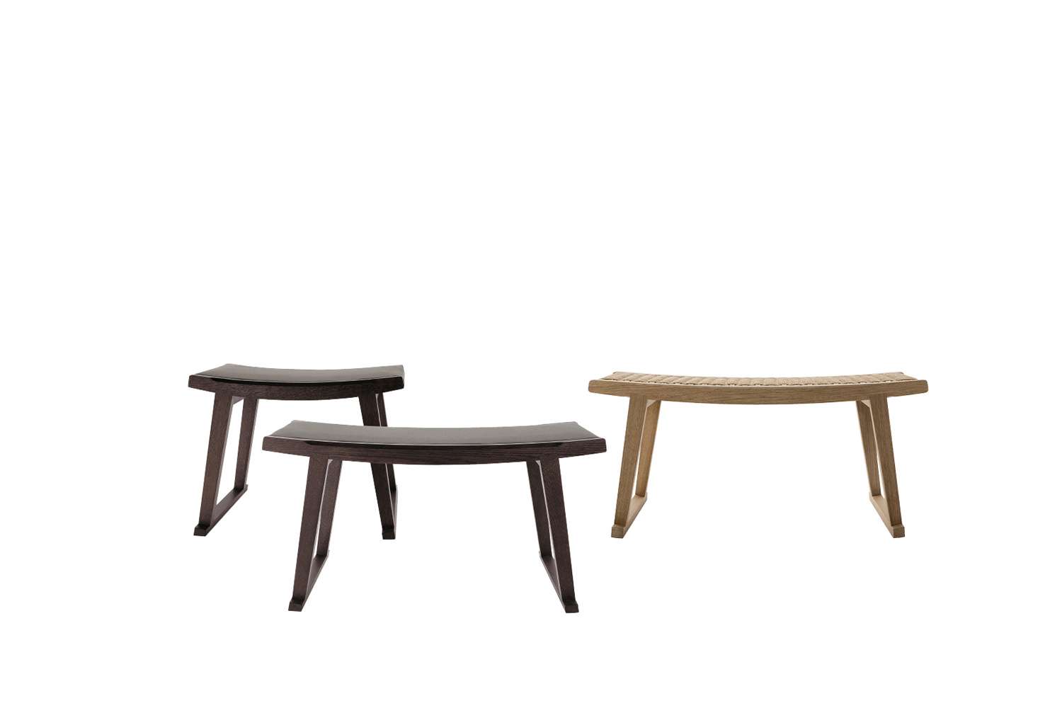 Sella<セラ>は、オリエンタルな模様を思わせるベンチで、凹んだ座面には、布や革、または天然のセルロースロープのインターレースで布張りが可能です。構造体は無垢材で、さまざまな仕上げが施されています。