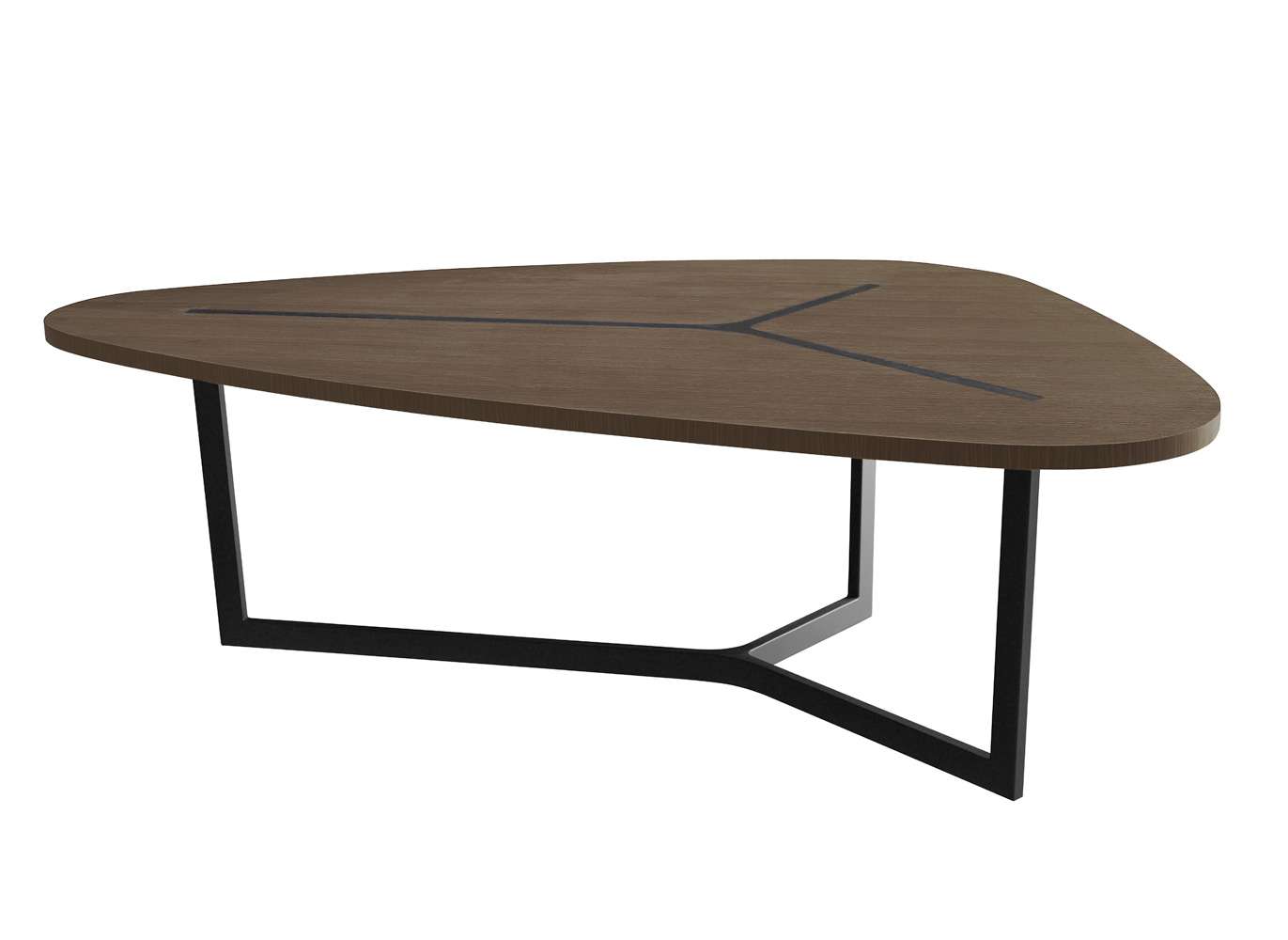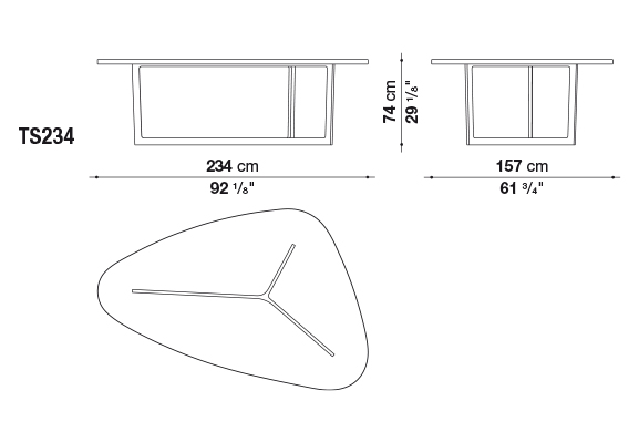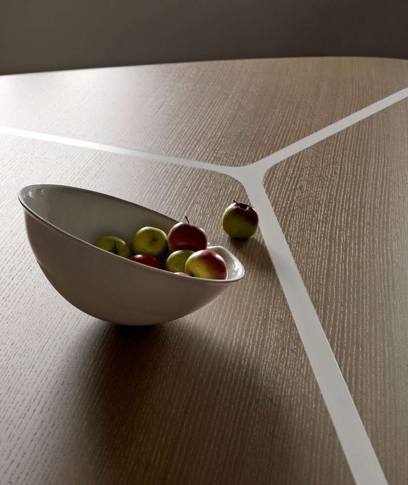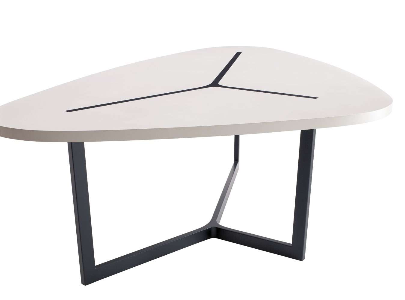 三辺の長さがそれぞれ異なる独特な形状のトップが特徴的です。7人掛けで、デザイナーが意図したようにテーブルの周りに3+2+2で椅子を配置することができます。独特の存在感を与えるSeven<セブン>は、その強いインパクトで部屋のレイアウトの認識を変えるものとなります。3本の枝状のフレームがトップの表面へと抜けるようにしてグラフィカルな模様を作り出し、トップのカラーとコントラストをつけています。
