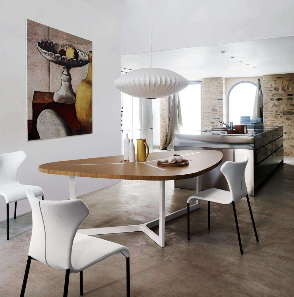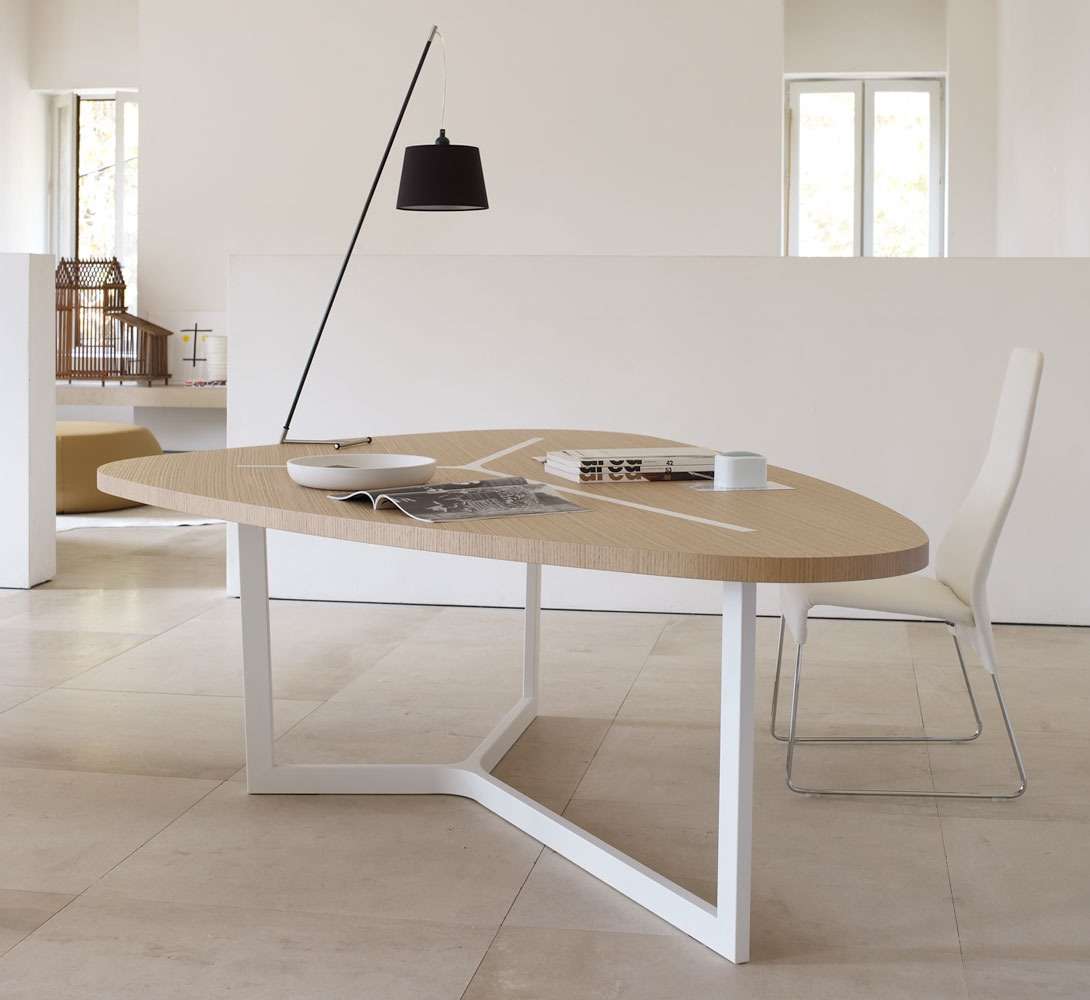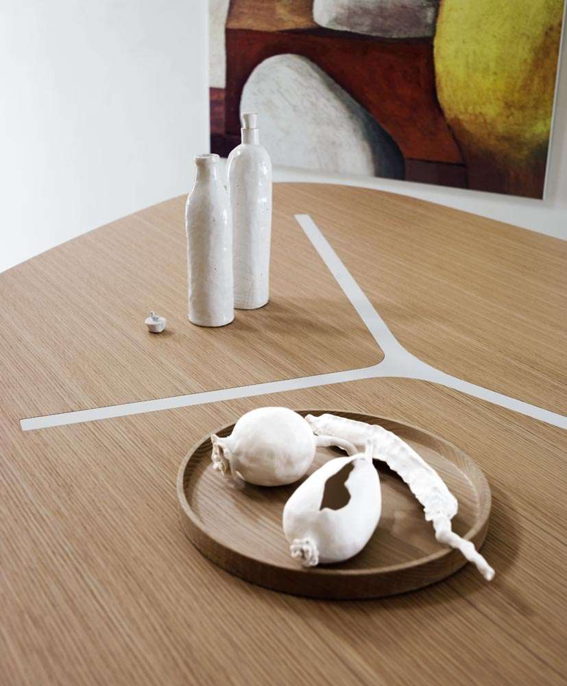 三辺の長さがそれぞれ異なる独特な形状のトップが特徴的です。7人掛けで、デザイナーが意図したようにテーブルの周りに3+2+2で椅子を配置することができます。独特の存在感を与えるSeven<セブン>は、その強いインパクトで部屋のレイアウトの認識を変えるものとなります。3本の枝状のフレームがトップの表面へと抜けるようにしてグラフィカルな模様を作り出し、トップのカラーとコントラストをつけています。