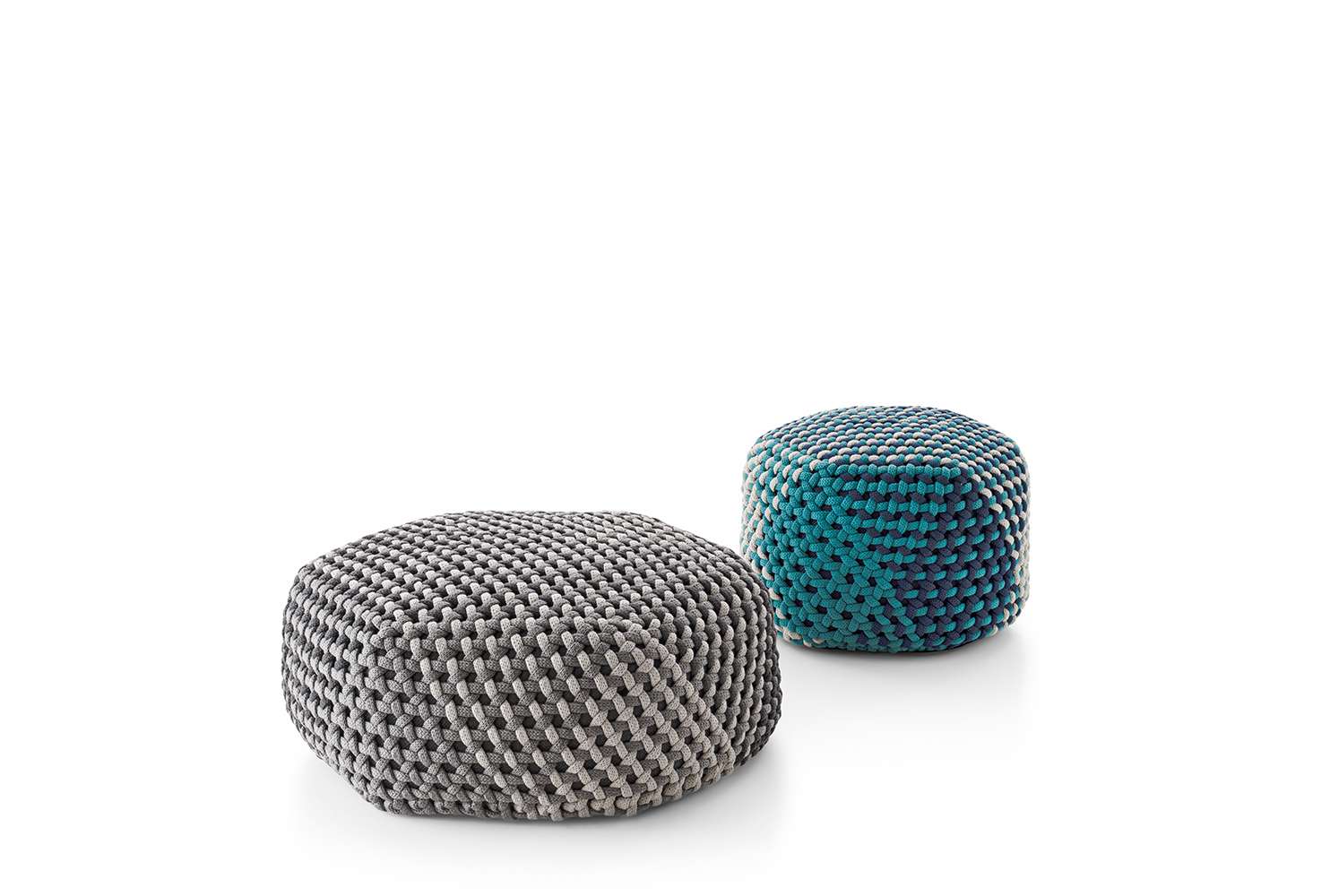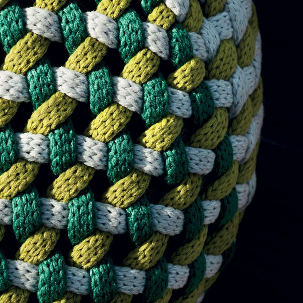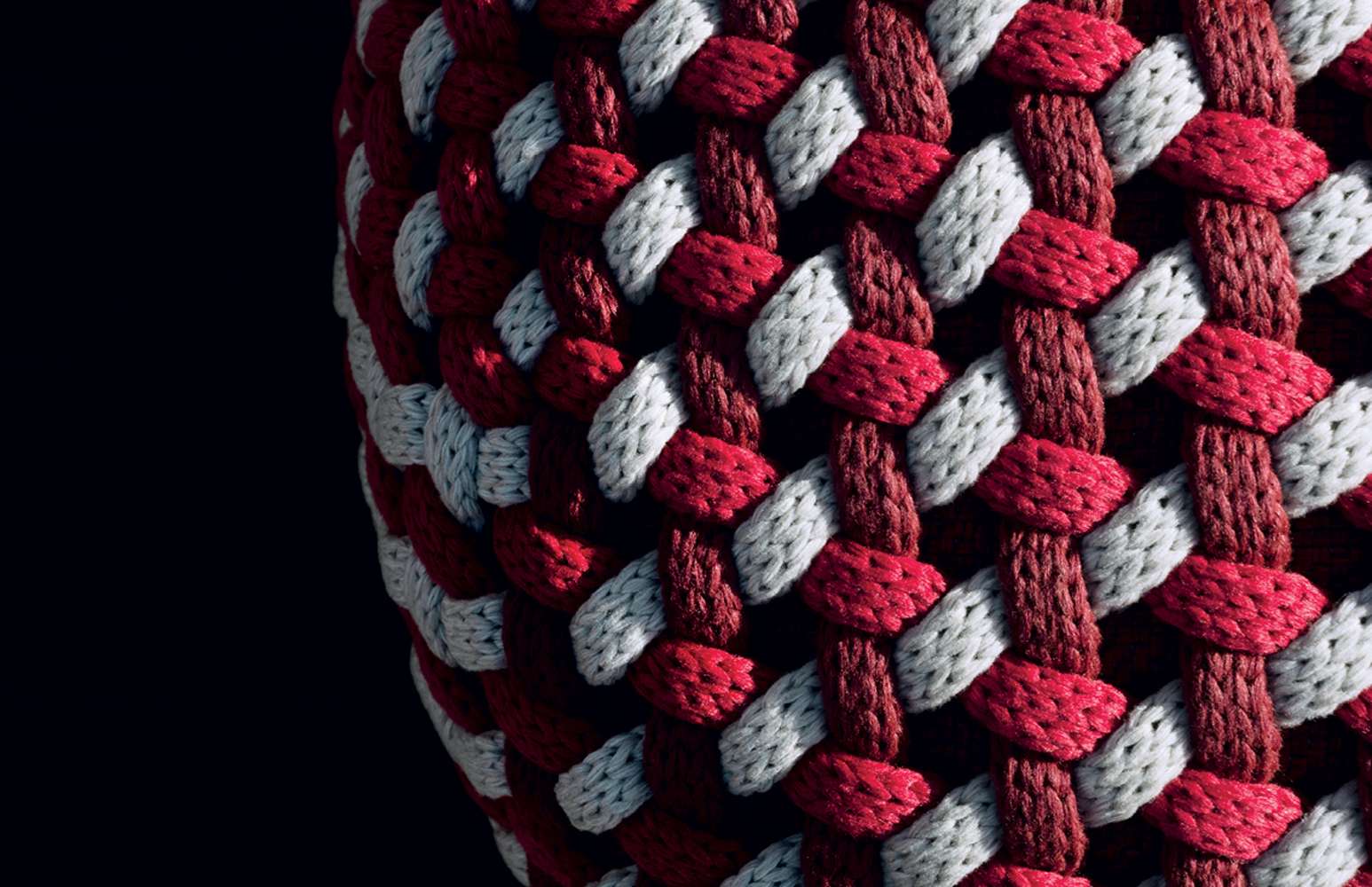ウンピッゾは家具用メッシュ生地に特化し手工芸により生産するテキスタイル・ラボかつデザインスタジオです。大型フォーマットのレース仕上げの研究を続け、B&B Italiaの新作オットマンであるTramae<トラマエ>にたどり着きました。3次元での表現を可能とし、六角形という形状が最大の特徴です。メッシュ生地はその縁が見えなくなるまで丸く覆っています。表面は素材と色の組み合わせ方がダイナミックで、伝統的なレース生地を現代風に再解釈し、他に類を見ない織り方で生き生きとした表情を見せています。