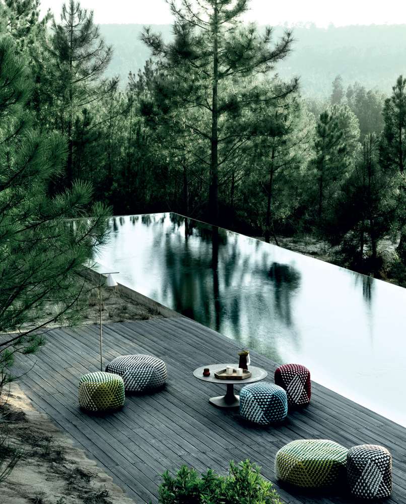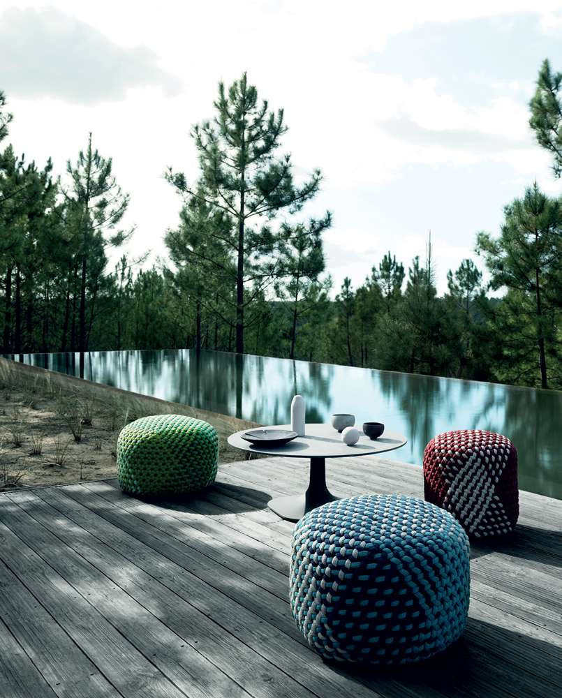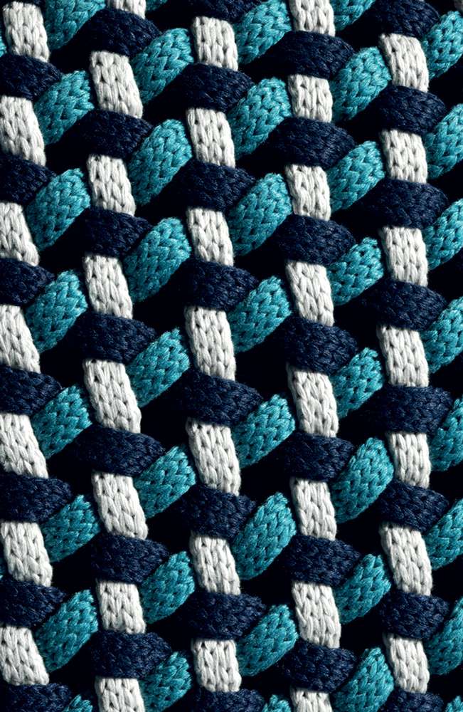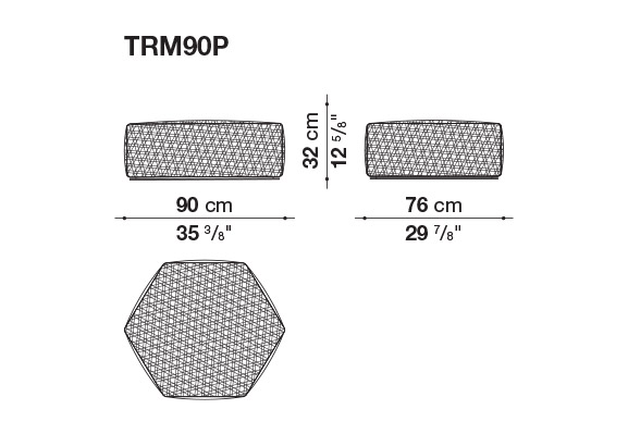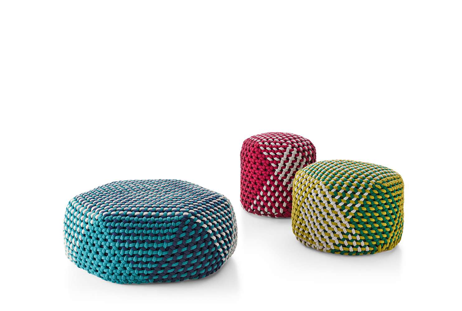 ウンピッゾは家具用メッシュ生地に特化し手工芸により生産するテキスタイル・ラボかつデザインスタジオです。大型フォーマットのレース仕上げの研究を続け、B&B Italiaの新作オットマンであるTramae<トラマエ>にたどり着きました。3次元での表現を可能とし、六角形という形状が最大の特徴です。メッシュ生地はその縁が見えなくなるまで丸く覆っています。表面は素材と色の組み合わせ方がダイナミックで、伝統的なレース生地を現代風に再解釈し、他に類を見ない織り方で生き生きとした表情を見せています。